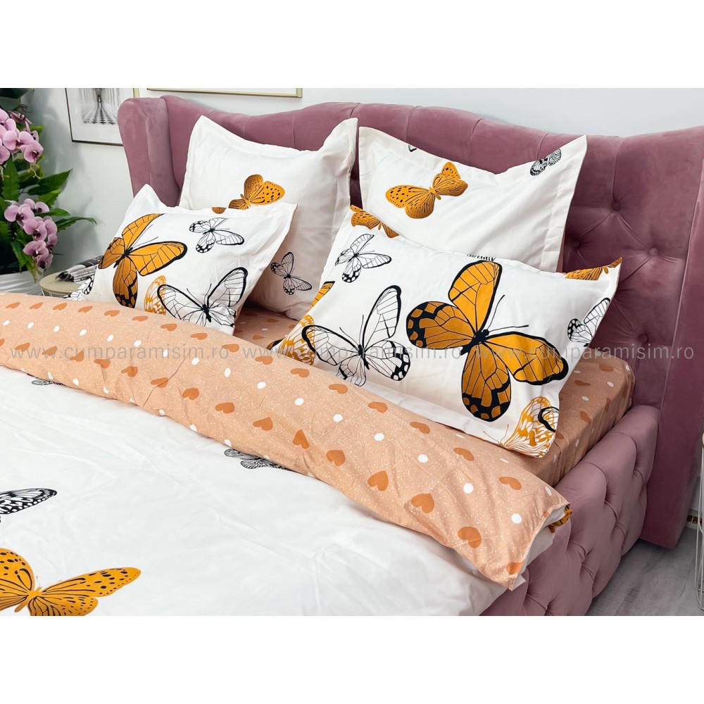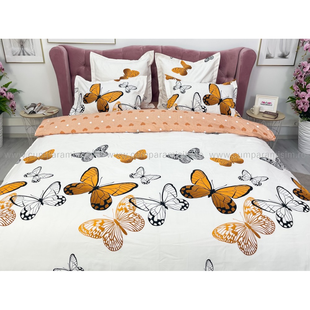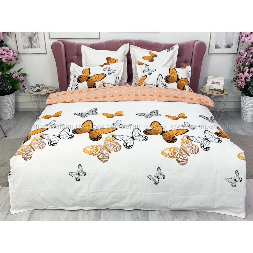 Lenjerie pat dublu (140x200cm, 160x200cm, 180x200cm), FINET, 6 piese, Bej, fluturi, Johny Home Pucioasa, cod produs: SPR-R60-227