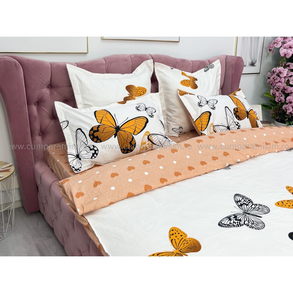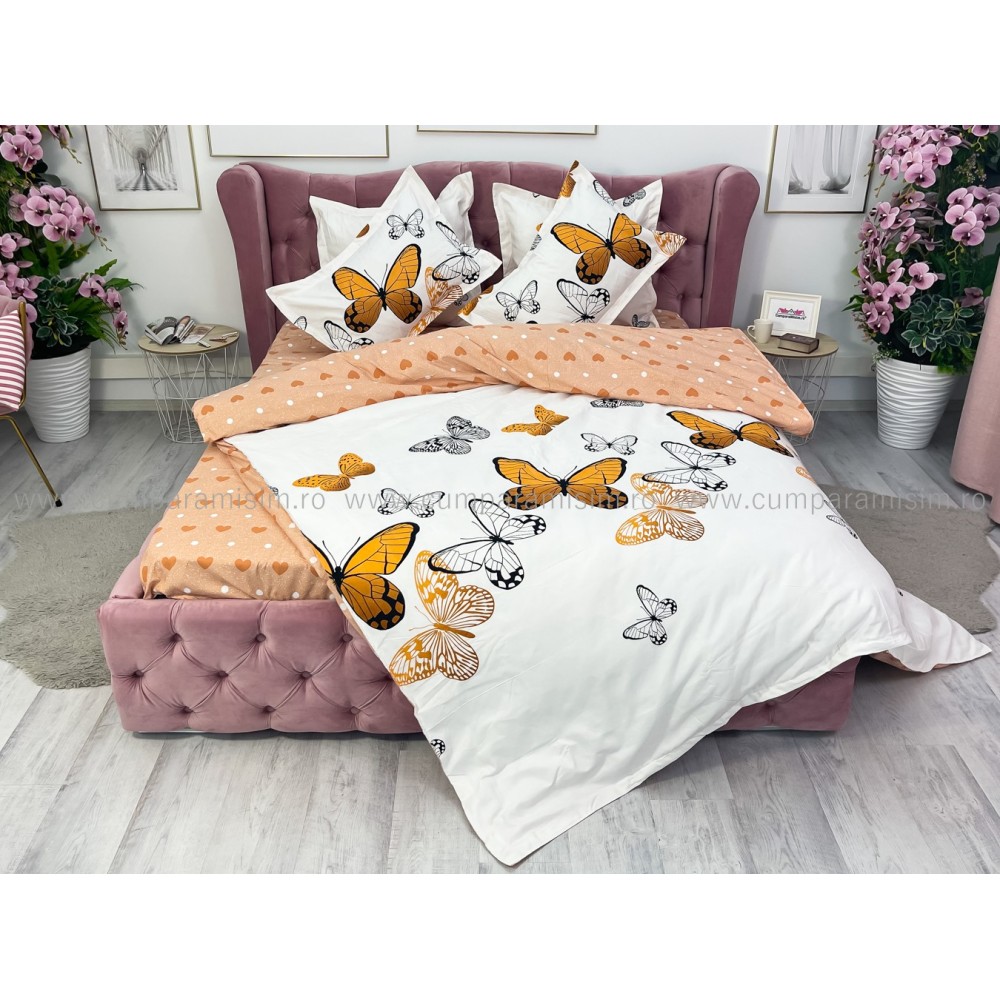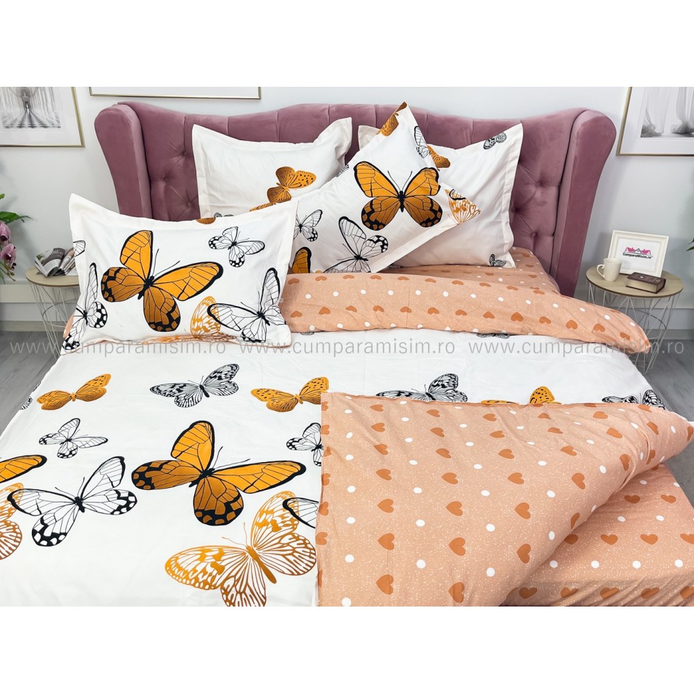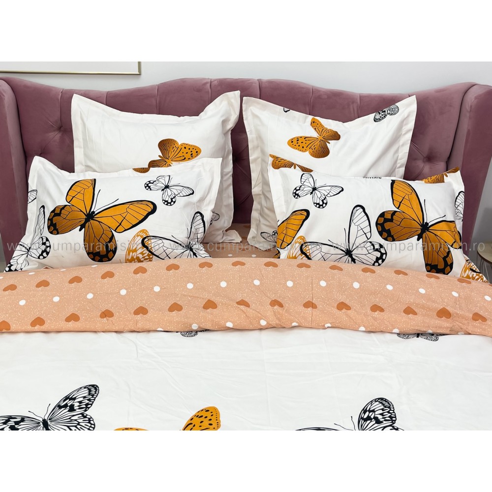 Lenjerie pat dublu (140x200cm, 160x200cm, 180x200cm), FINET, 6 piese, Bej, fluturi, Johny Home Pucioasa, cod produs: SPR-R60-227