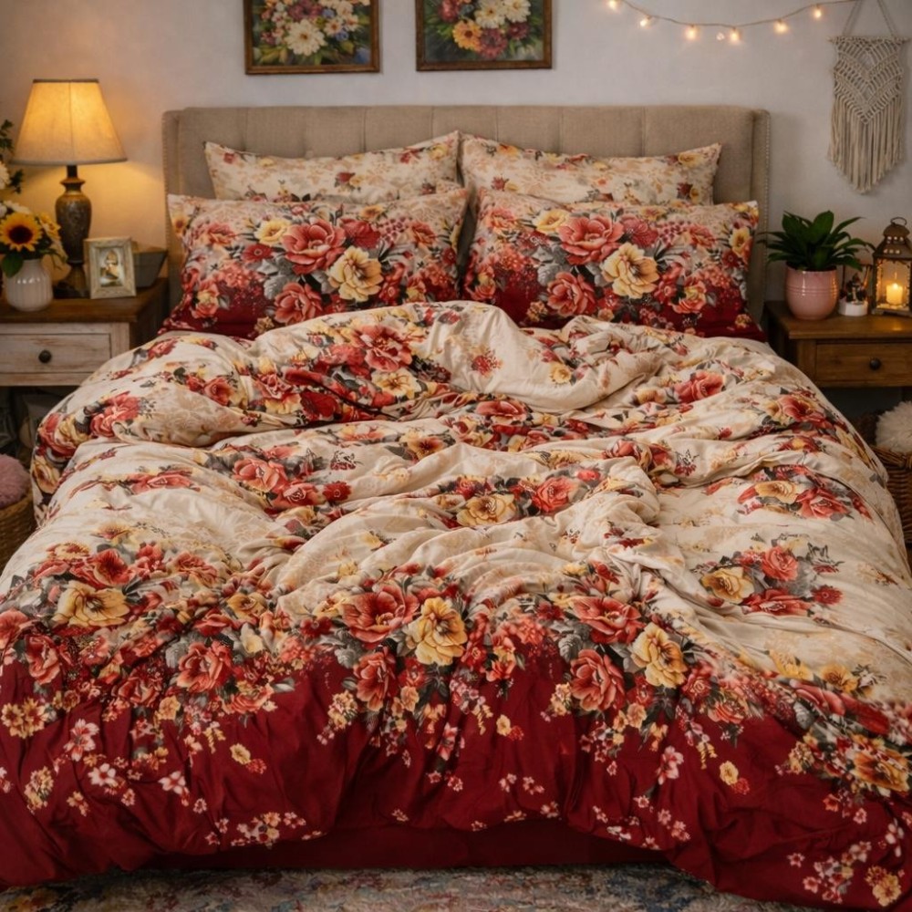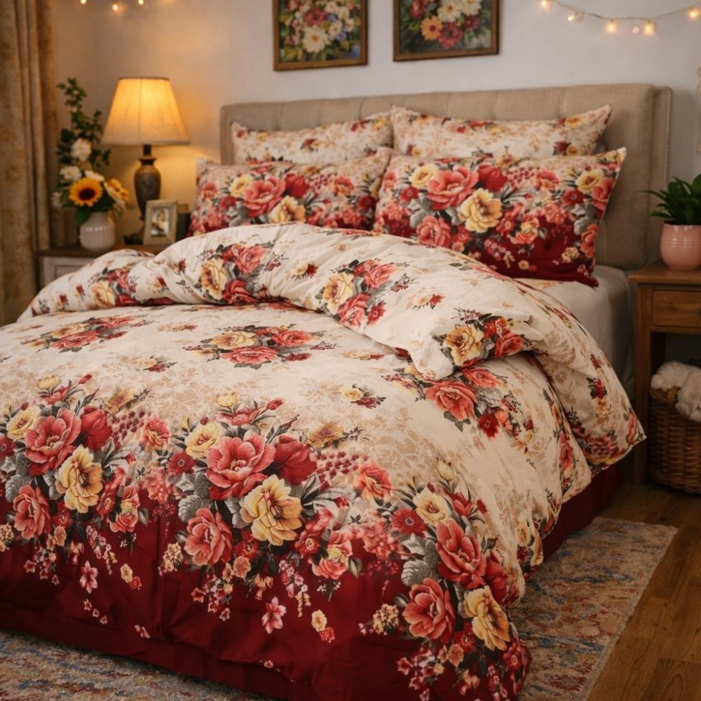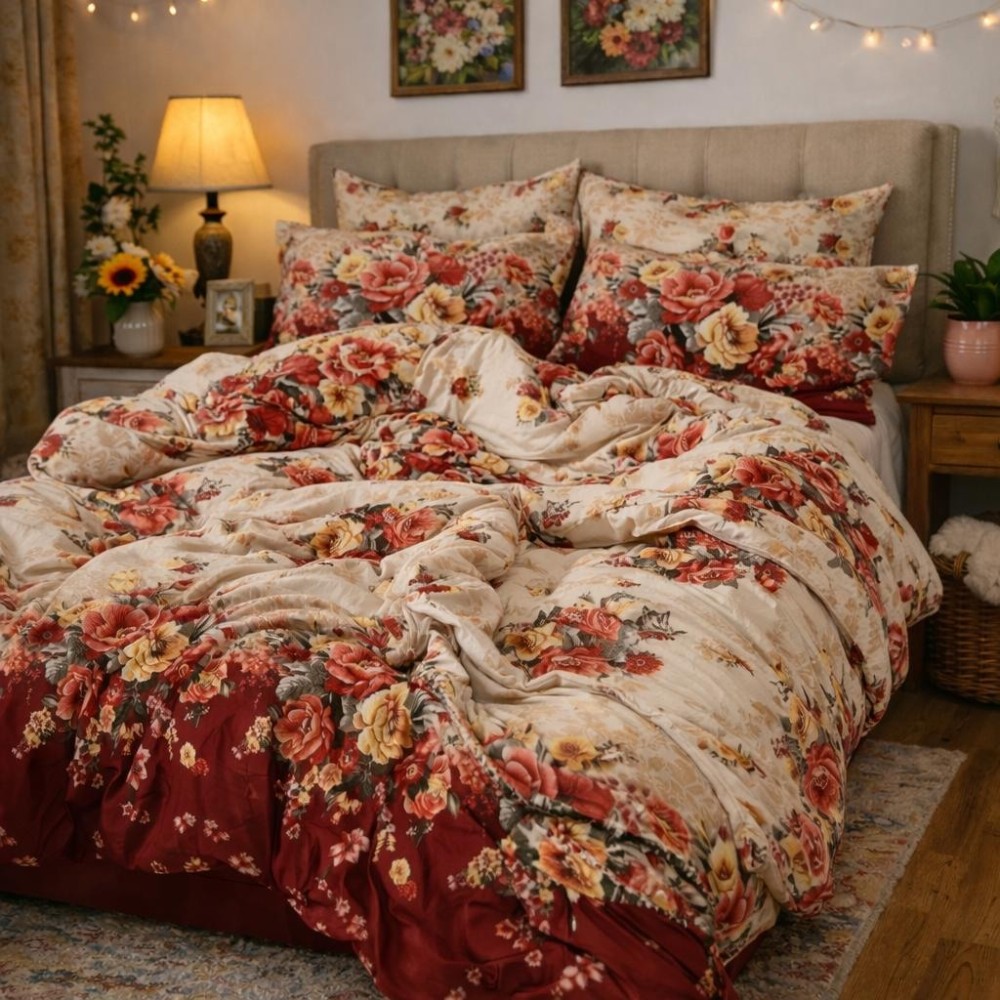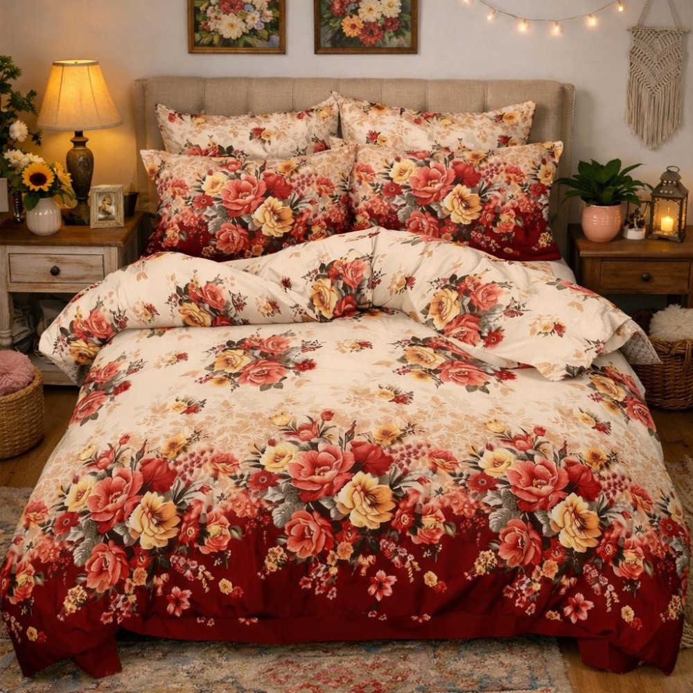 Lenjerie pat dublu, Finet, 6 piese, Bej-Rosu, flori, Johny Home Pucioasa, cod produs: SPR-R60-454