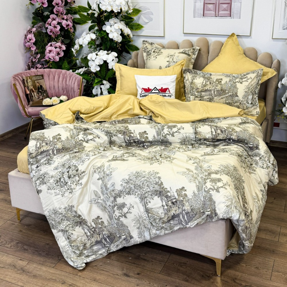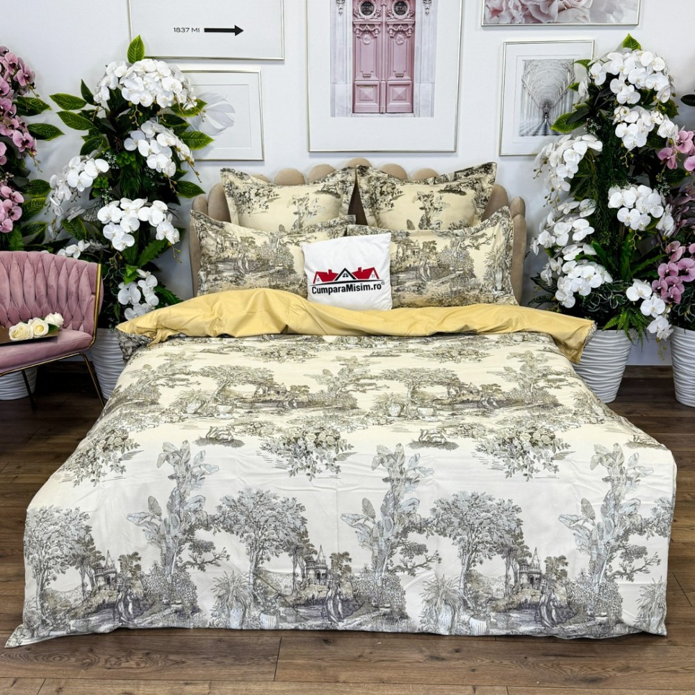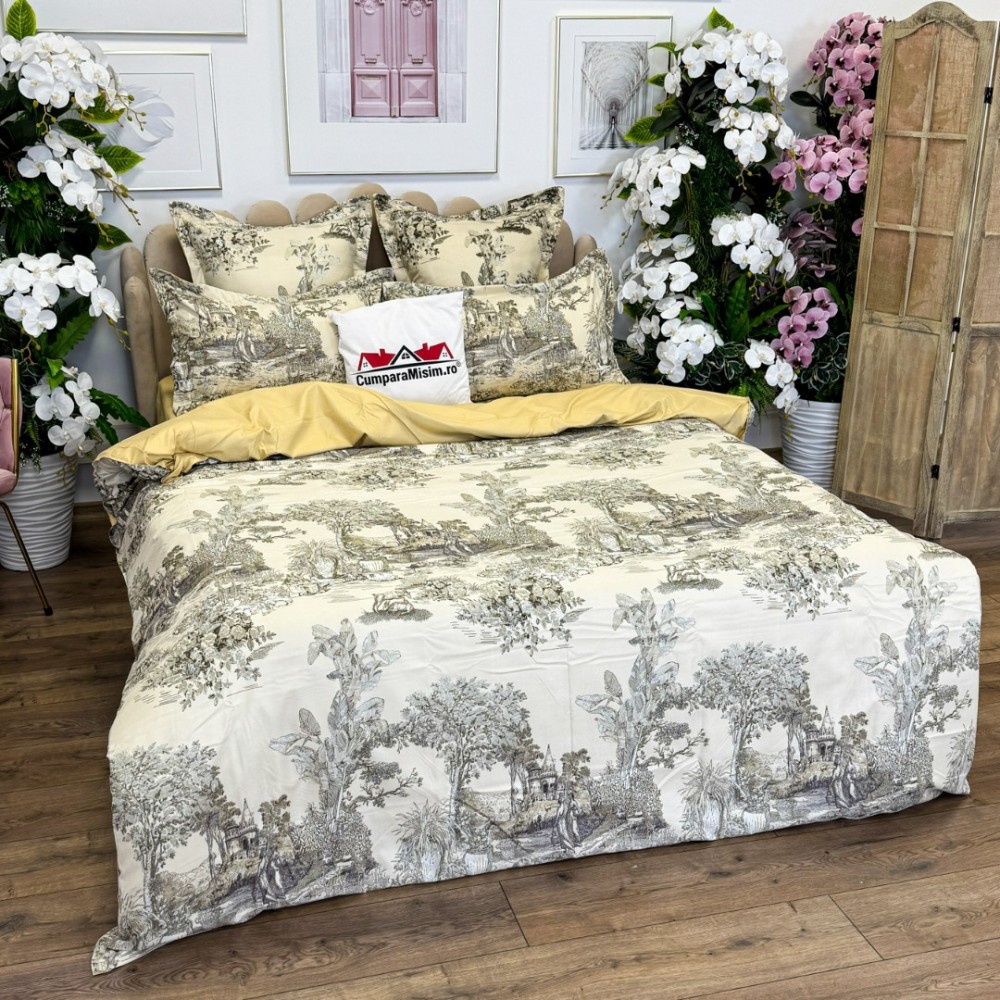 Lenjerie pat dublu (140x200cm, 160x200cm, 180x200cm), FINET, 6 piese, Bej, flori, copaci, Johny Home Pucioasa, cod produs: SPR-R60-530