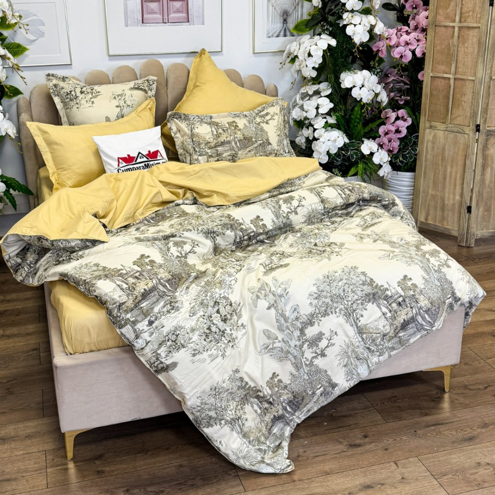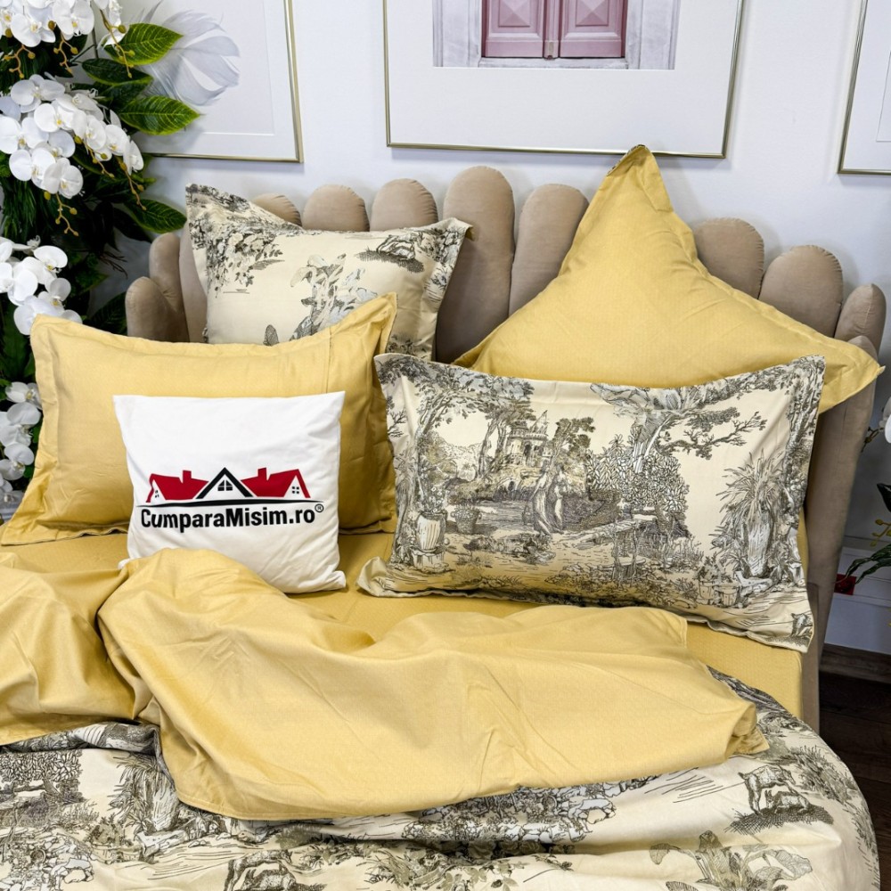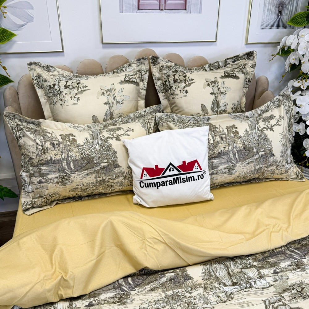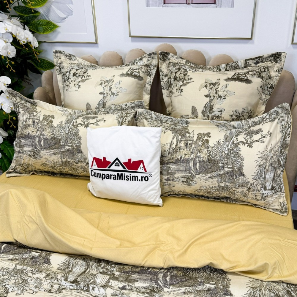 Lenjerie pat dublu (140x200cm, 160x200cm, 180x200cm), FINET, 6 piese, Bej, flori, copaci, Johny Home Pucioasa, cod produs: SPR-R60-530