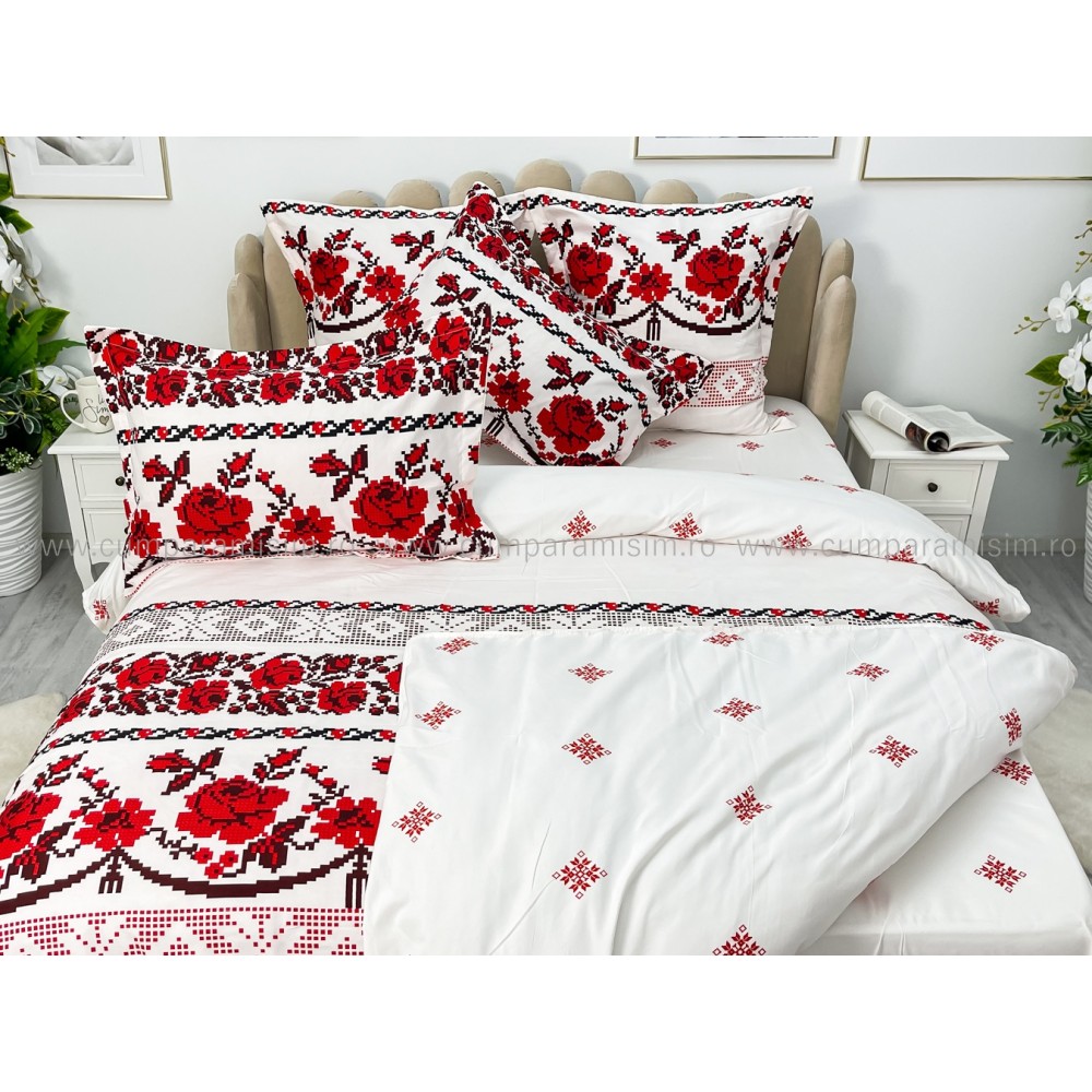 Lenjerie pat dublu (140x200cm, 160x200cm, 180x200cm), FINET, 6 piese, Alb-Rosu, model traditional, Johny Home Pucioasa, cod produs: SPR-R60-471