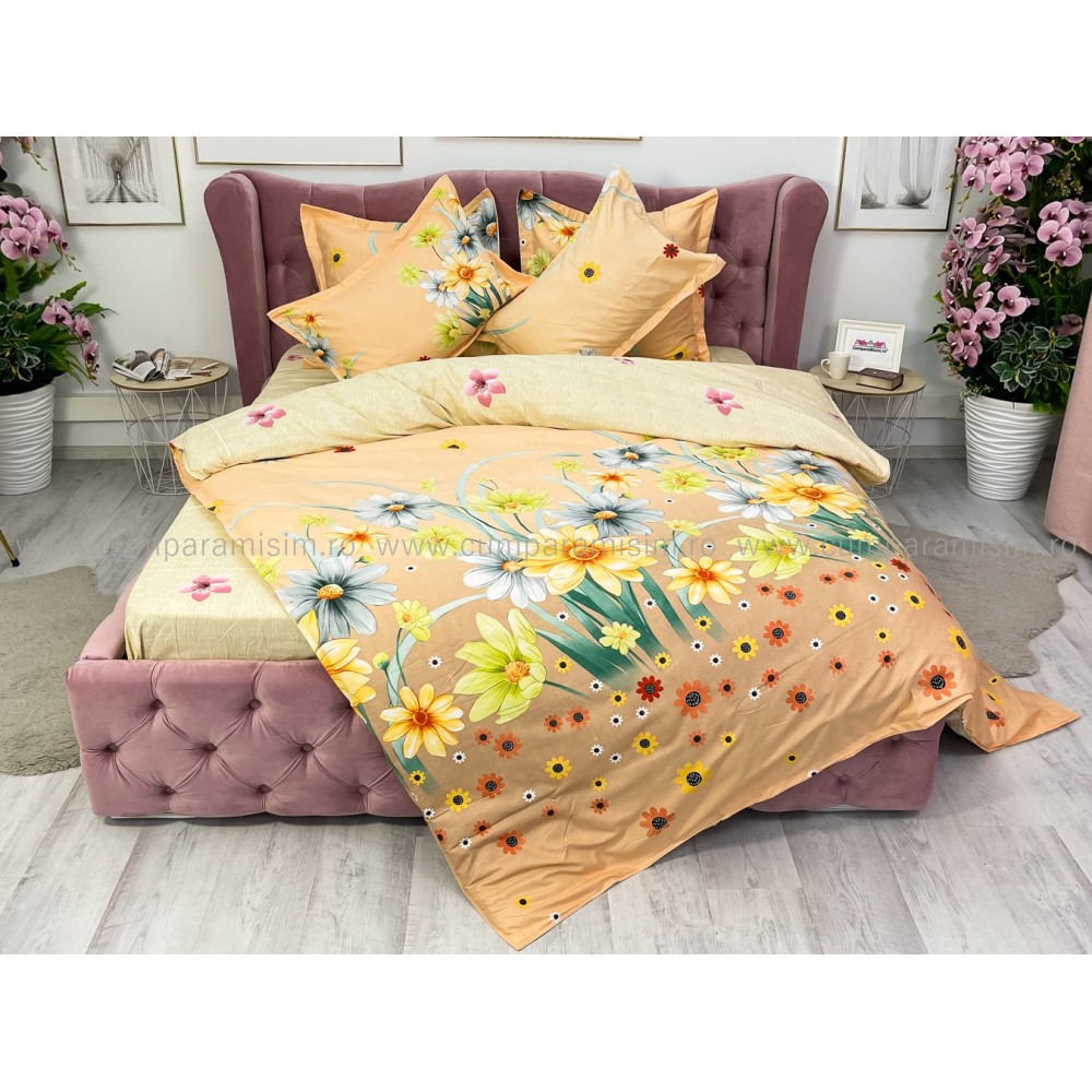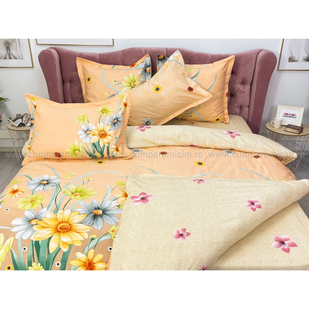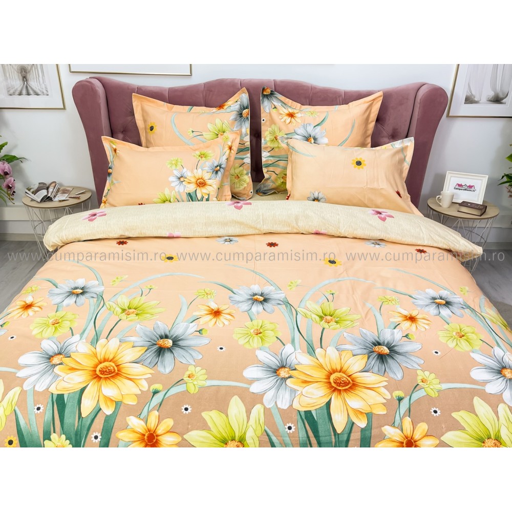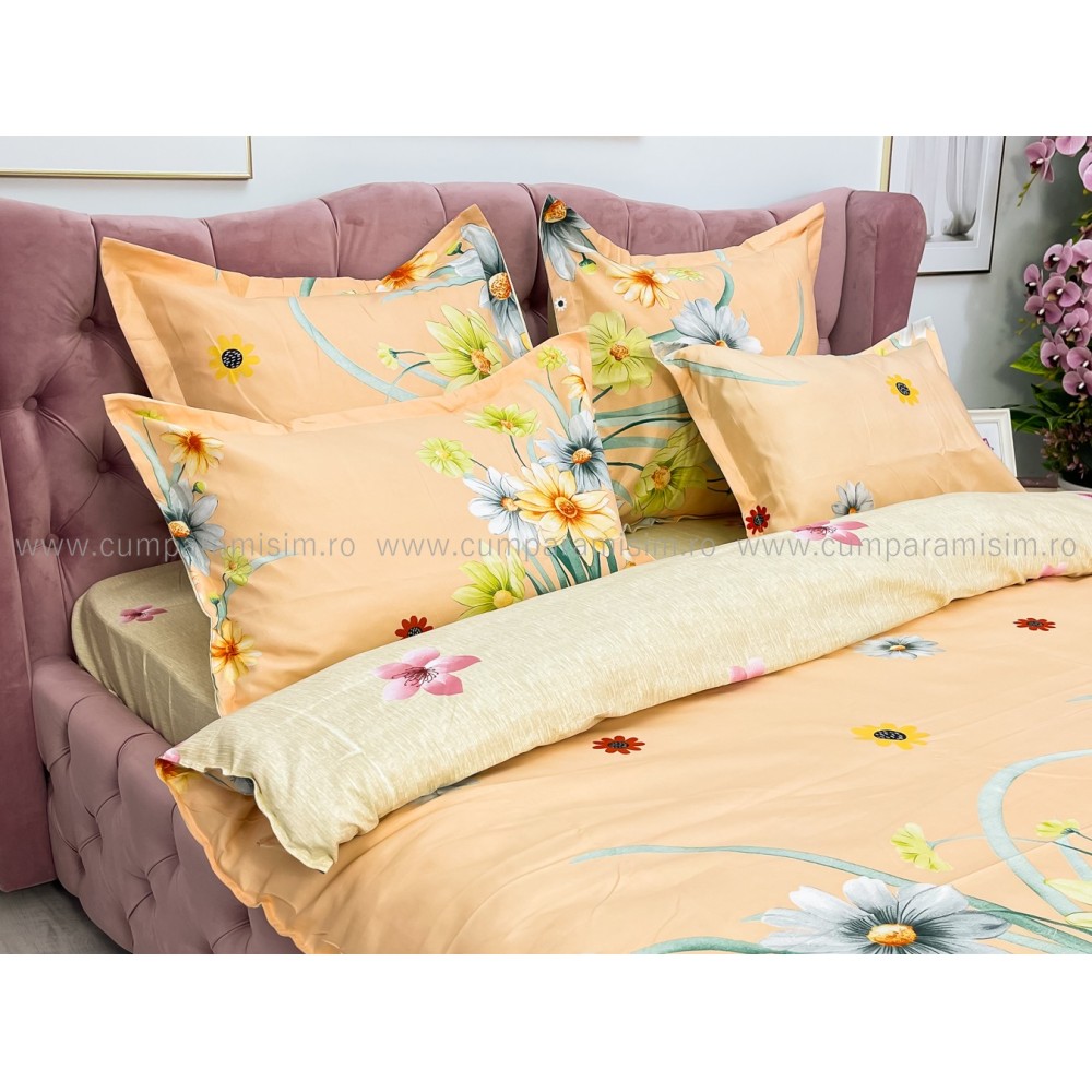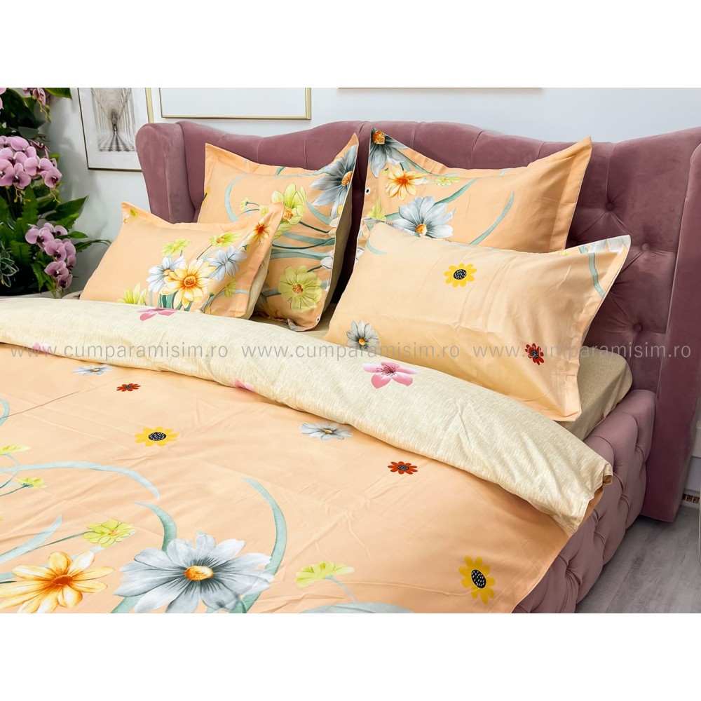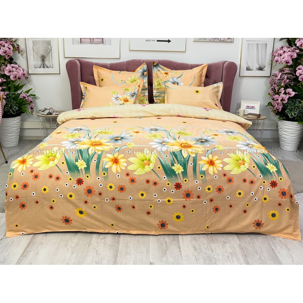Lenjerie pat dublu (160x200cm, 180x200cm), FINET, 6 piese, cu ELASTIC, Bej, flori, Johny Home Pucioasa, cod produs: SPR-T-170