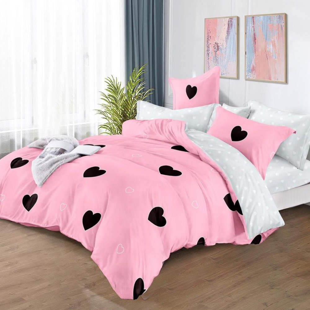 Lenjerie pat dublu (160x200cm, 180x200cm), FINET, 6 piese, cu ELASTIC, Roz, inimioare, Johny Home Pucioasa, cod produs: SPR-T-18