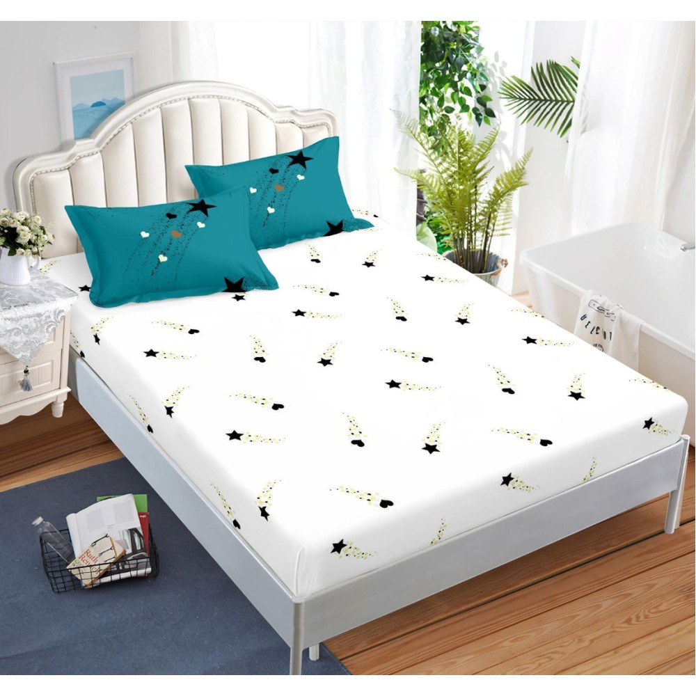 Lenjerie pat dublu cu ELASTIC, Finet, 6 piese, Turquoise, stelute, Johny Home Pucioasa, cod produs: SPR-T-52