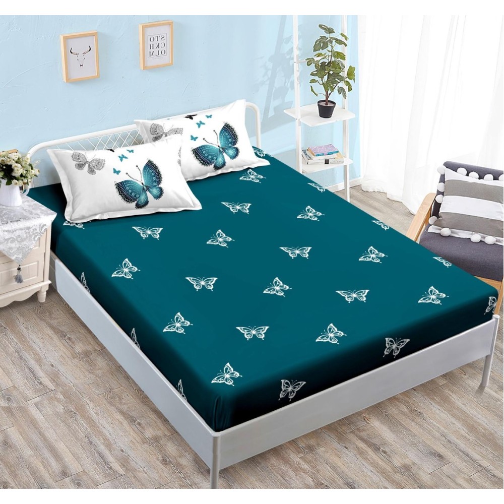 Lenjerie pat dublu cu ELASTIC, Finet, 6 piese, Turquoise, fluturi, Johny Home Pucioasa, cod produs: SPR-T-78