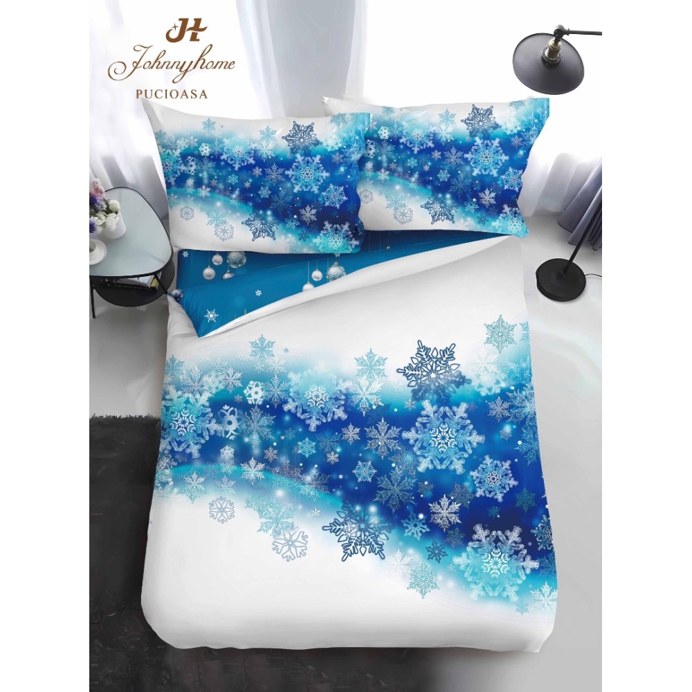 Lenjerie pat 1 PERSOANA, BUMBAC FINET, 4 piese, Identică cu Poza, Craciun, Alb, Bleu, fulgi de nea, Johny Home Pucioasa, cod produs: SPR-Qy-08