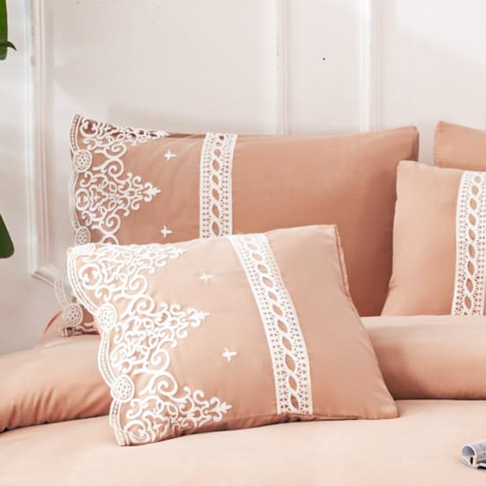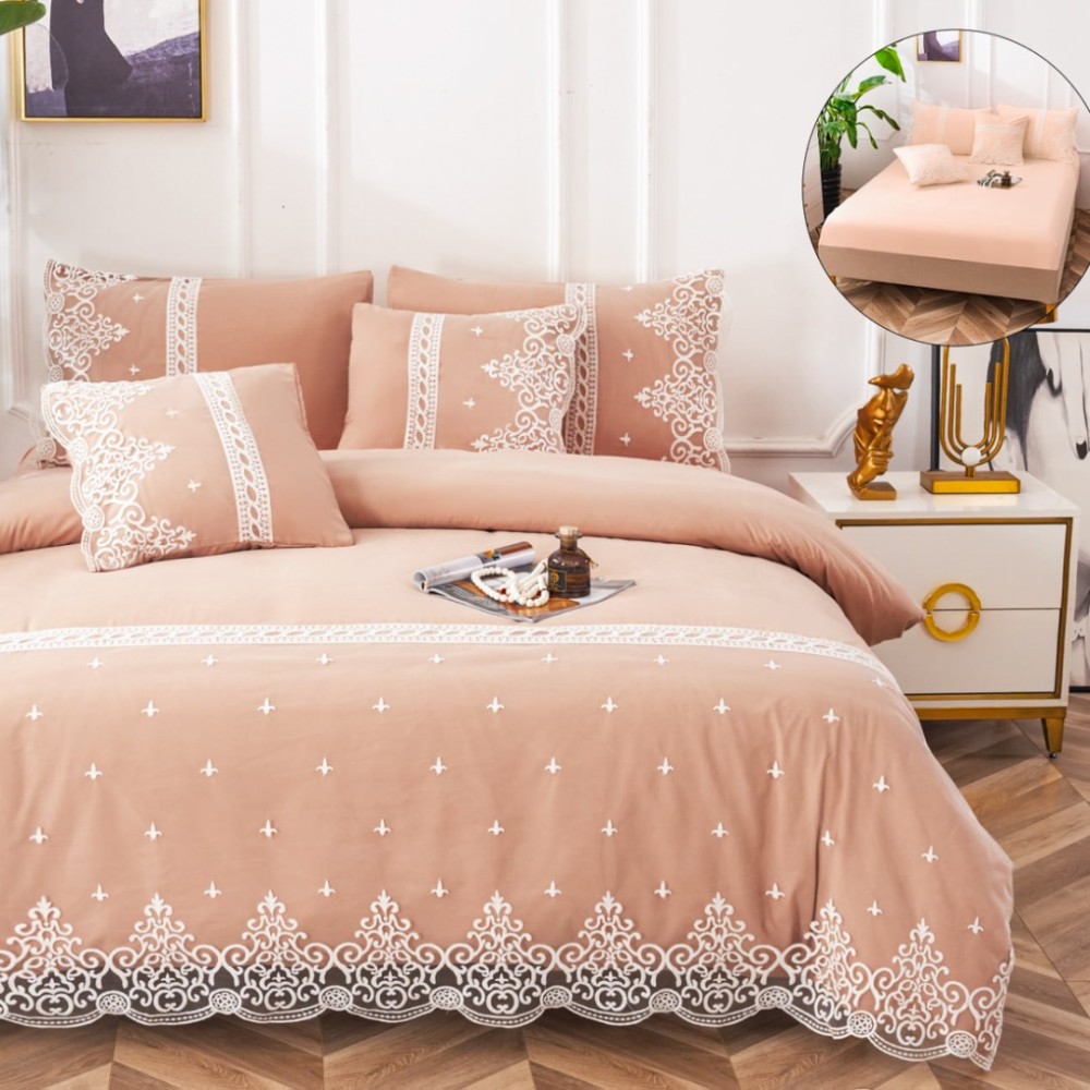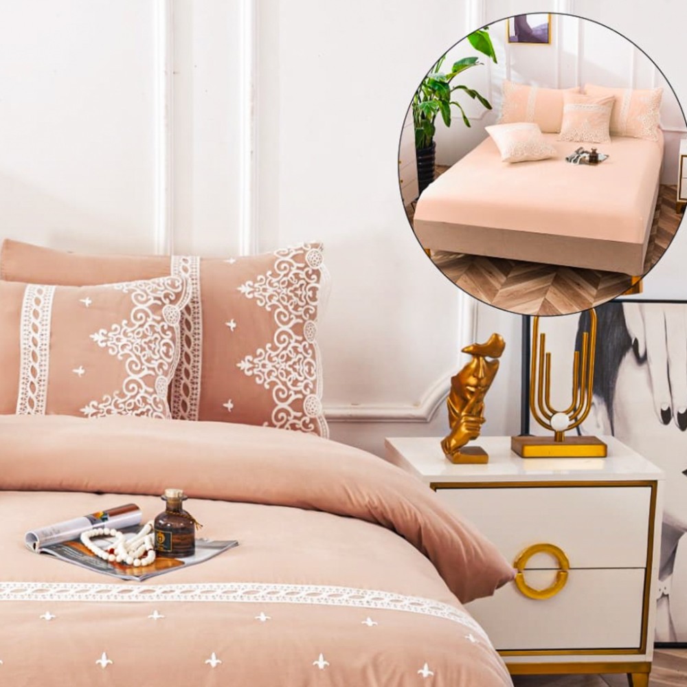 Lenjerie pat dublu, Fin cu Dantela si Broderie Rafinata, CEARSAF CU ELASTIC, 6 piese, Piersica, Insula Lenjeriei, cod produs: INS-BFD03