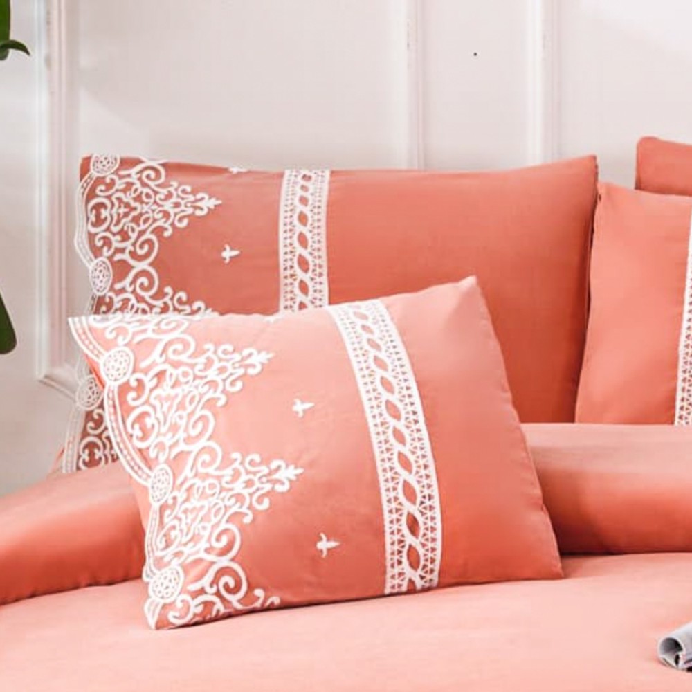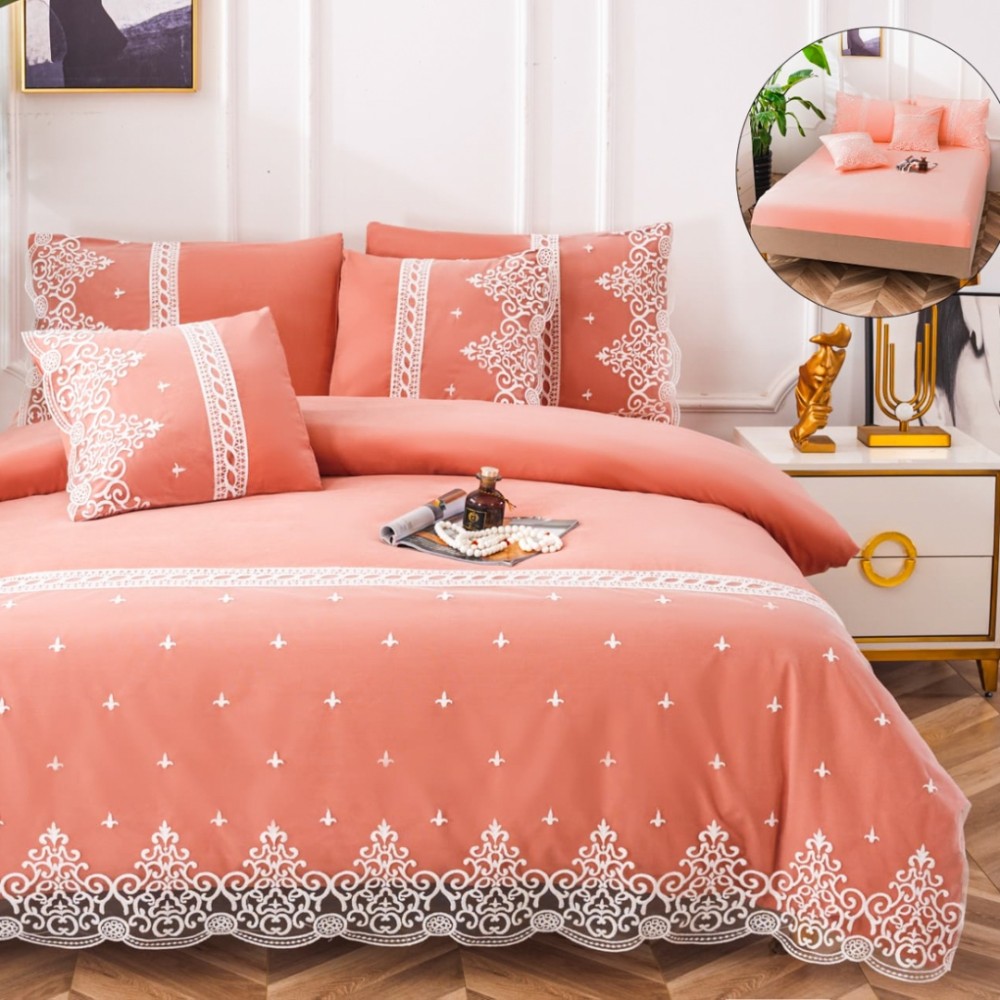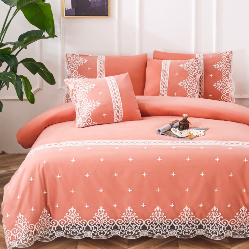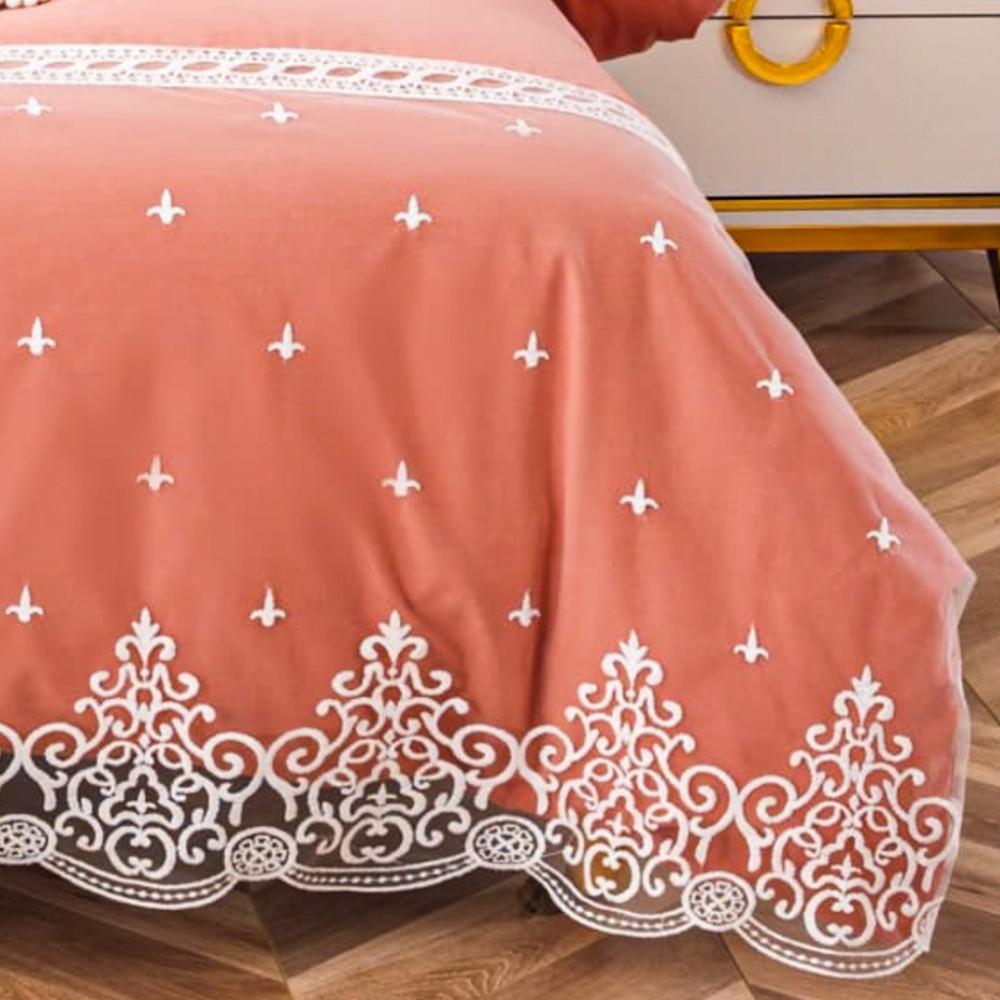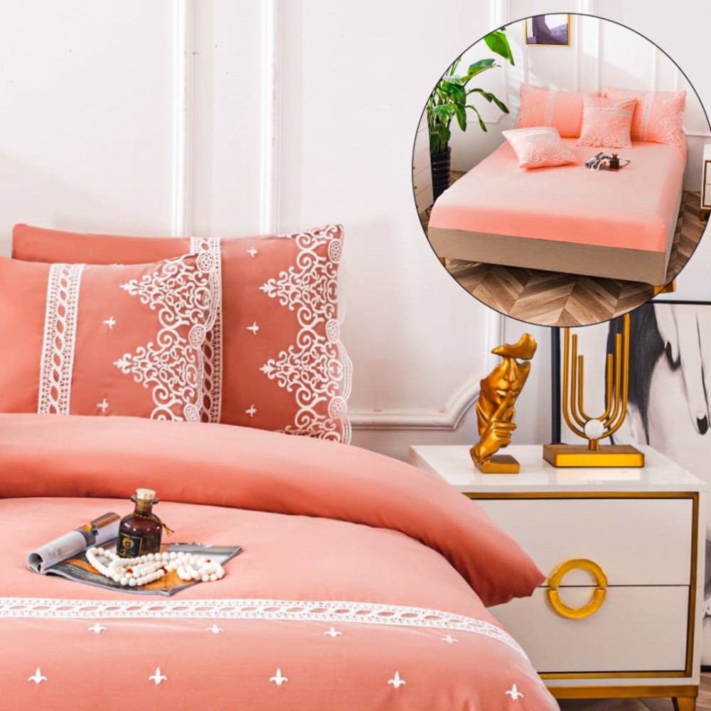 Lenjerie pat dublu, Fin cu Dantela si Broderie Rafinata, CEARSAF CU ELASTIC, 6 piese, Somon, Insula Lenjeriei, cod produs: INS-BFD04