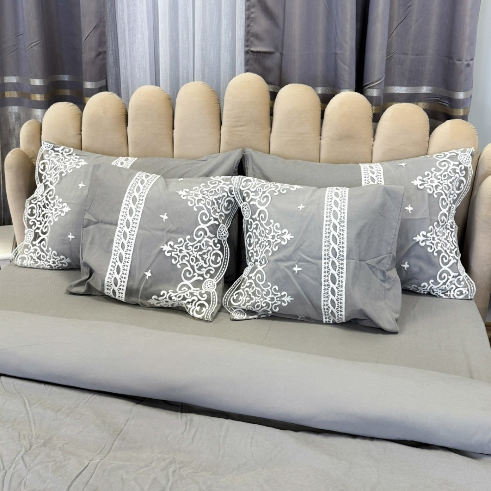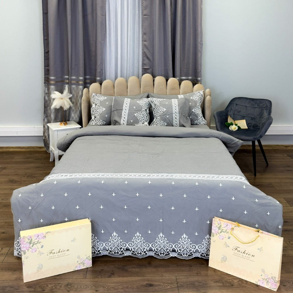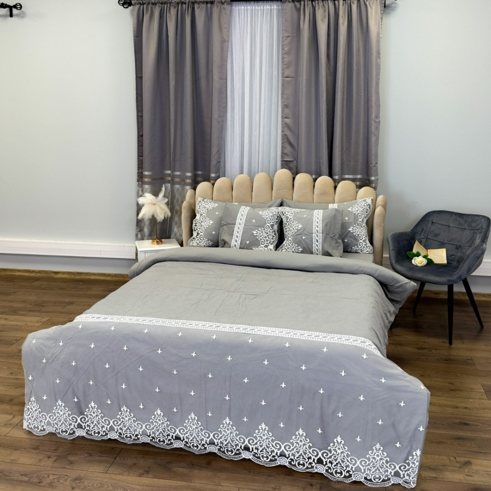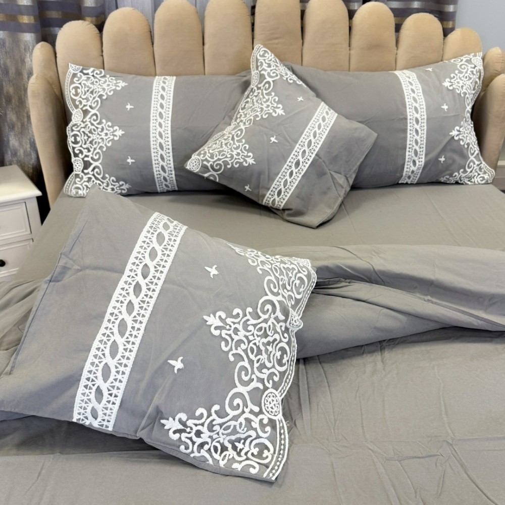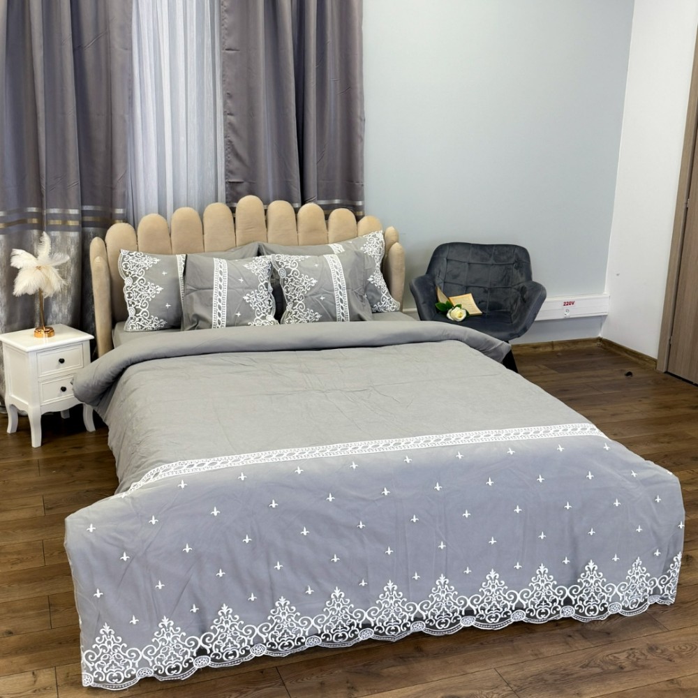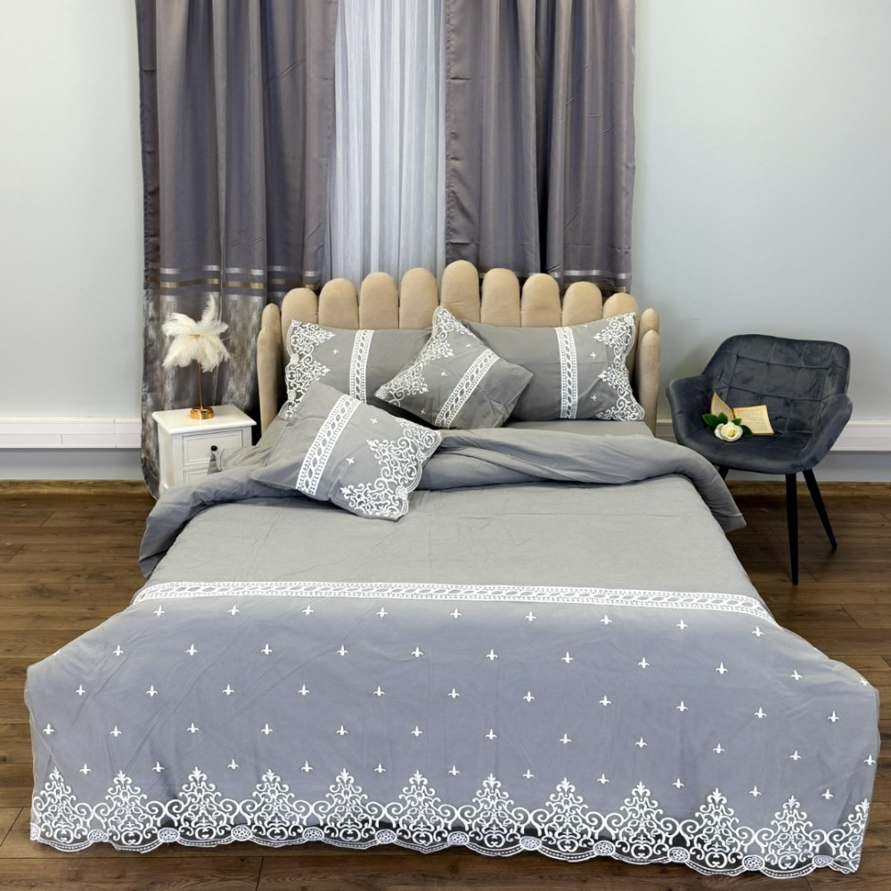 Lenjerie pat dublu, Fin cu Dantela si Broderie Rafinata, CEARSAF CU ELASTIC, 6 piese, Gri, Insula Lenjeriei, cod produs: INS-BFD06