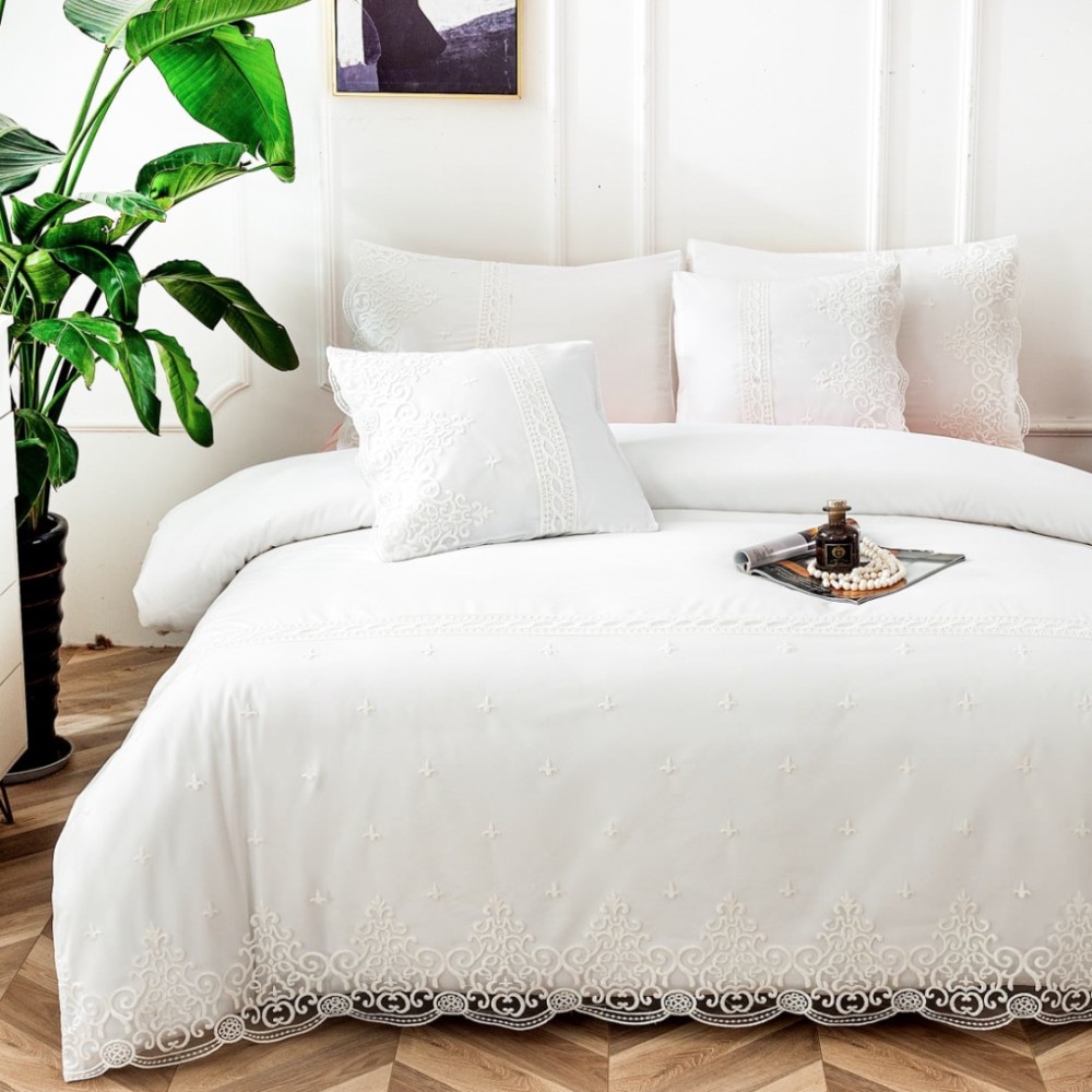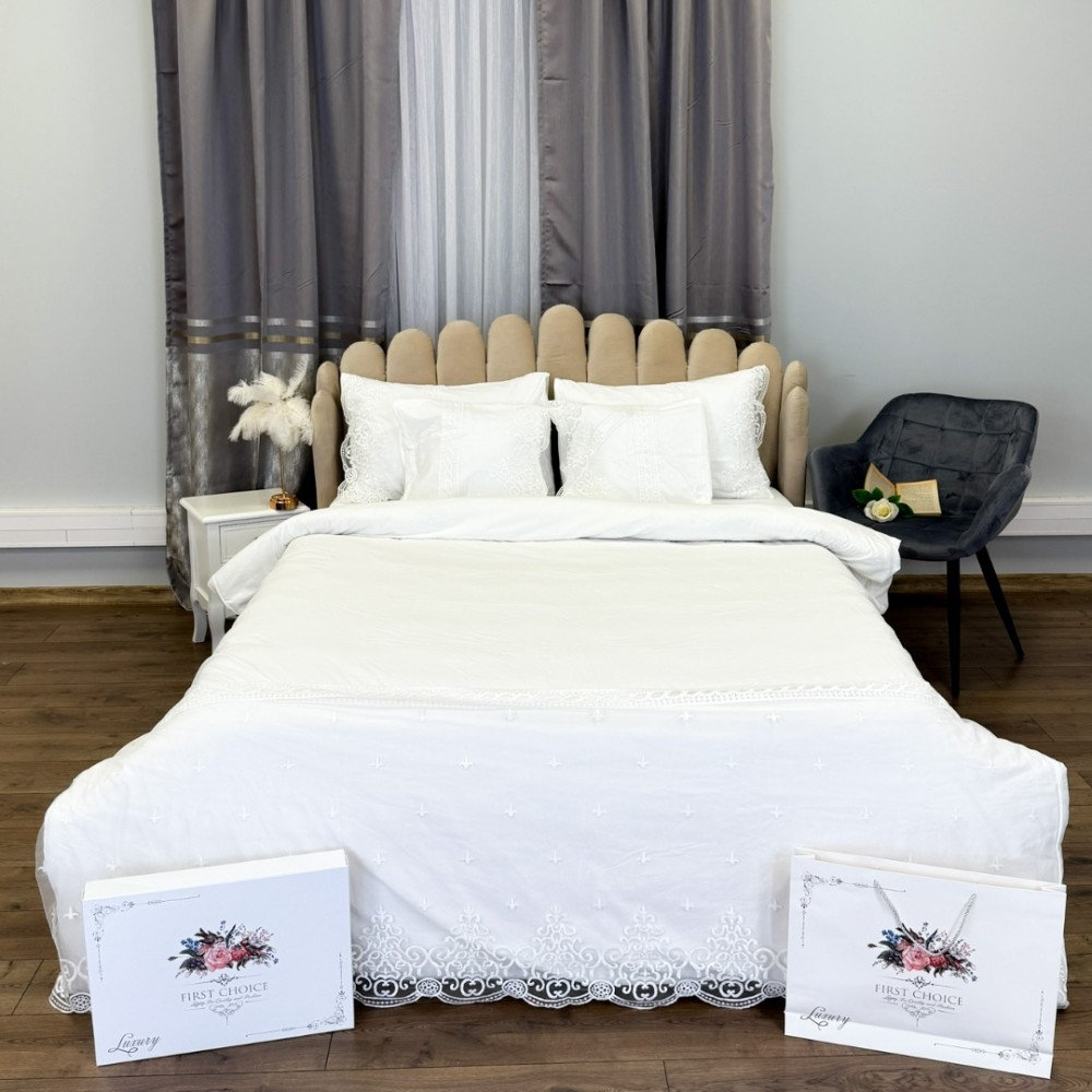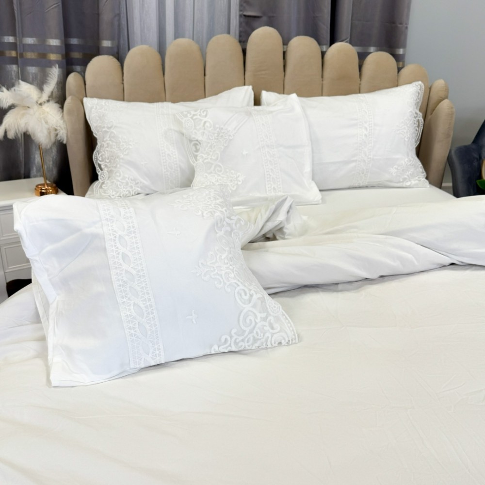 Lenjerie pat dublu, Fin cu Dantela si Broderie Rafinata, CEARSAF CU ELASTIC, 6 piese, Alb, Insula Lenjeriei, cod produs: INS-BFD09