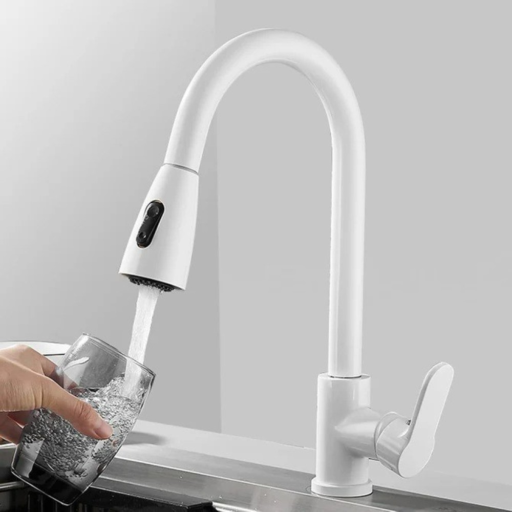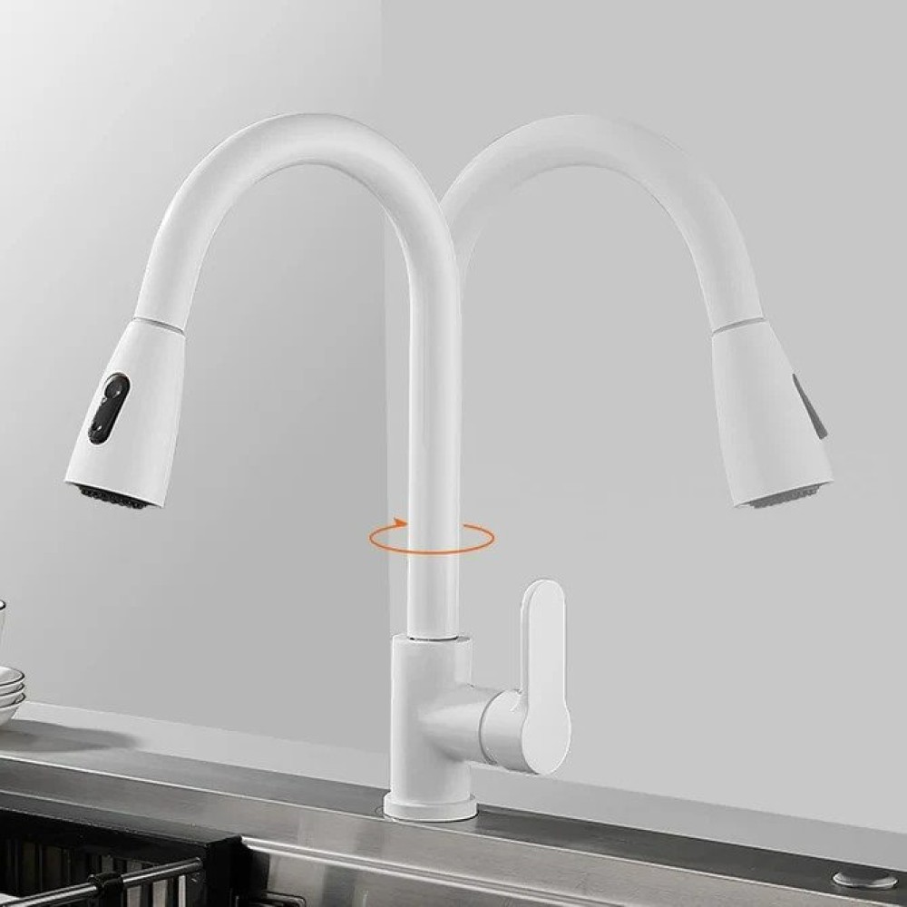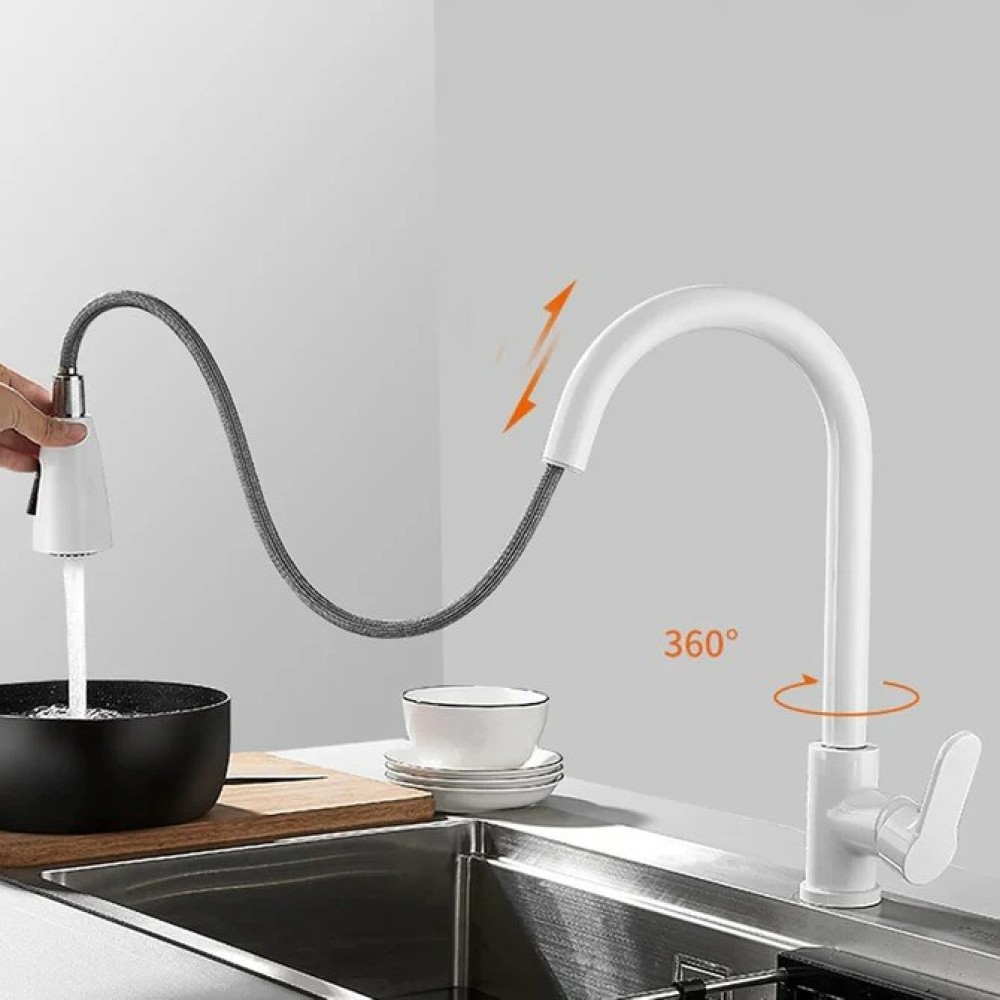 Îmbunătățește funcționalitatea bucătăriei tale cu această baterie telescopică albă, rotativă la 360°, echipată cu duș extractibil pentru o curățare eficientă. Designul modern și finisajul elegant se potrivesc perfect în orice bucătărie contemporană. Fabricată din materiale durabile, această baterie oferă două moduri de curgere a apei și o instalare ușoară, fiind compatibilă cu majoritatea chiuvetelor standard.