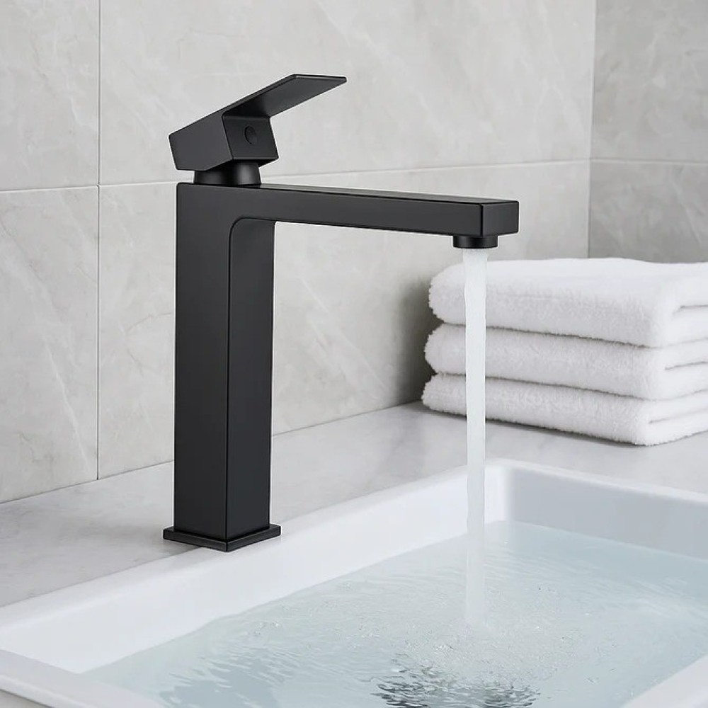 Adaugă un plus de eleganță băii tale cu această baterie de lavoar neagră mată, cu design pătrat modern și finisaj premium.