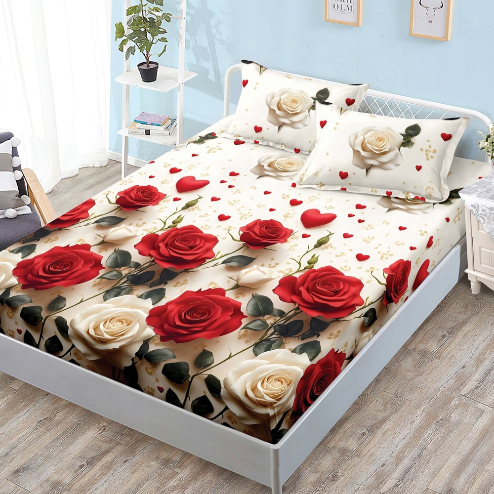 Cearșaf cu Elastic, Bumbac Satinat, 160x200 cm + 2 Fețe de Pernă 50x70 cm, Crem, trandafiri, Johny Home Pucioasa, cod produs: SPR-JE-19