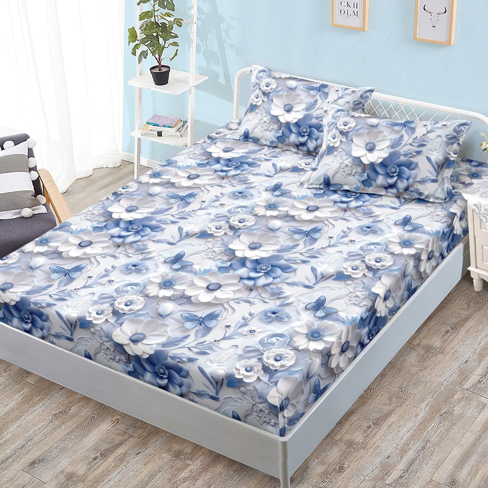 Cearșaf cu Elastic, Bumbac Satinat, 180x200 cm + 2 Fețe de Pernă 50x70 cm, Albastru, flori, Johny Home Pucioasa, cod produs: SPR-J-61