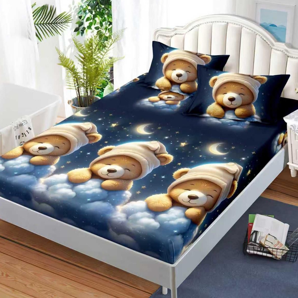 Cearșaf cu Elastic, Bumbac Satinat, 180x200 cm + 2 Fețe de Pernă 50x70 cm, Albastru, ursuleti, Johny Home Pucioasa, cod produs: SPR-J-79