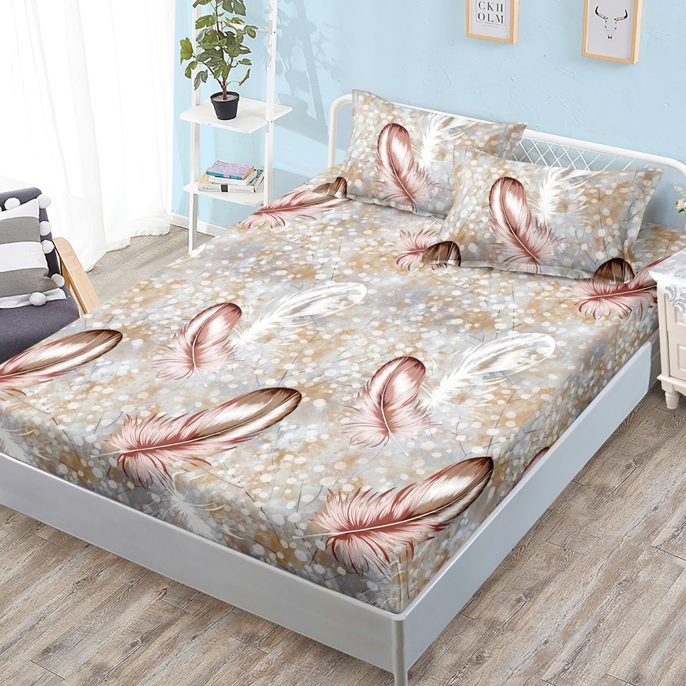 Cearșaf cu Elastic, Bumbac Satinat, 180x200 cm + 2 Fețe de Pernă 50x70 cm, Bej, pene, Johny Home Pucioasa, cod produs: SPR-J-74
