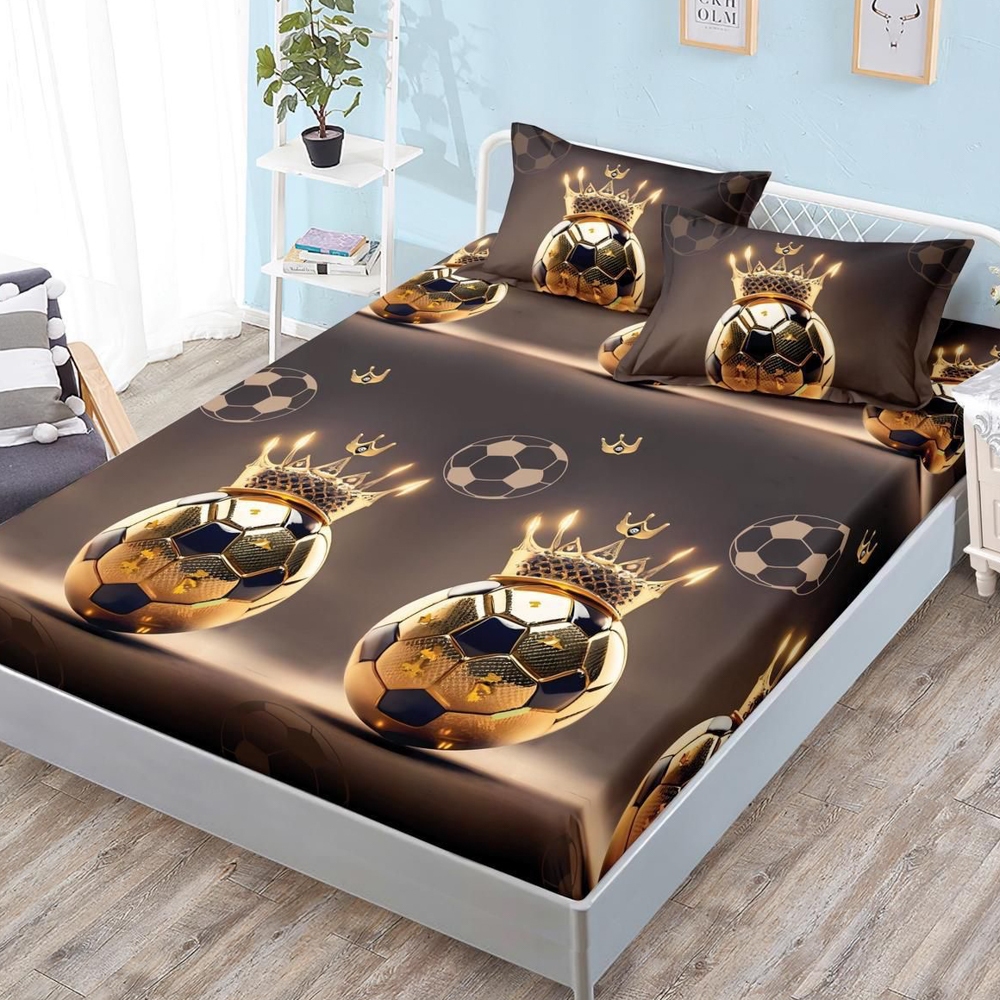 Cearșaf cu Elastic, Bumbac Satinat, 180x200 cm + 2 Fețe de Pernă 50x70 cm, Maro, minge fotbal, Johny Home Pucioasa, cod produs: SPR-J-60