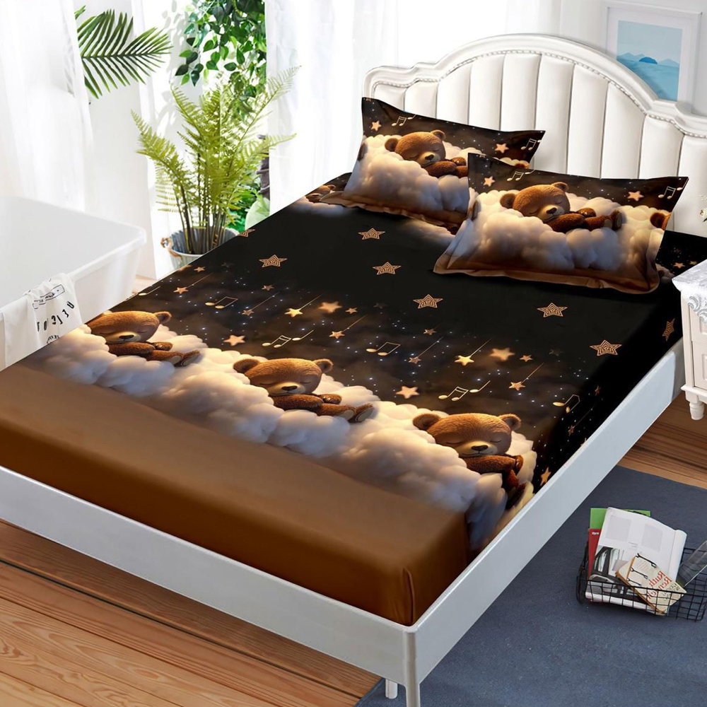 Cearșaf cu Elastic, Bumbac Satinat, 180x200 cm + 2 Fețe de Pernă 50x70 cm, Maro, ursuleti, Johny Home Pucioasa, cod produs: SPR-J-88