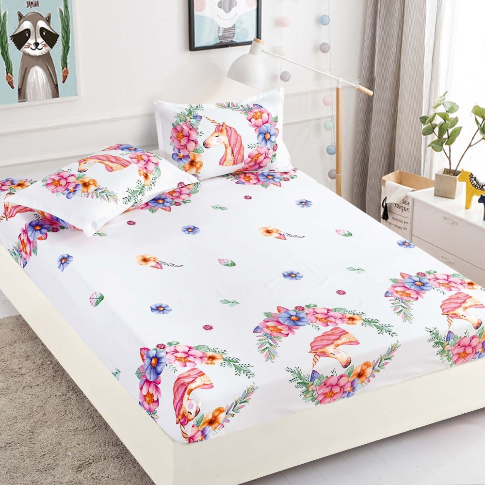 Cearsaf cu elastic, Bumbac FINET, 160/180x200cm, 2 fete de perne 50x70cm, Jojo Home, Alb-Multicolor, unicorni, cod produs: JOJ-HD-34