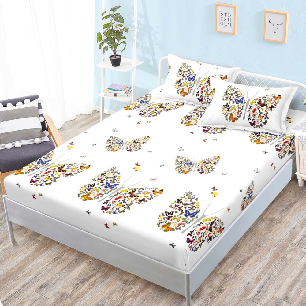 Cearsaf cu elastic, Bumbac FINET, 160x200cm, 2 fete de perne 50x70cm, Alb, Fluturi, Super Design Pucioasa, cod produs: SDP-HH-149