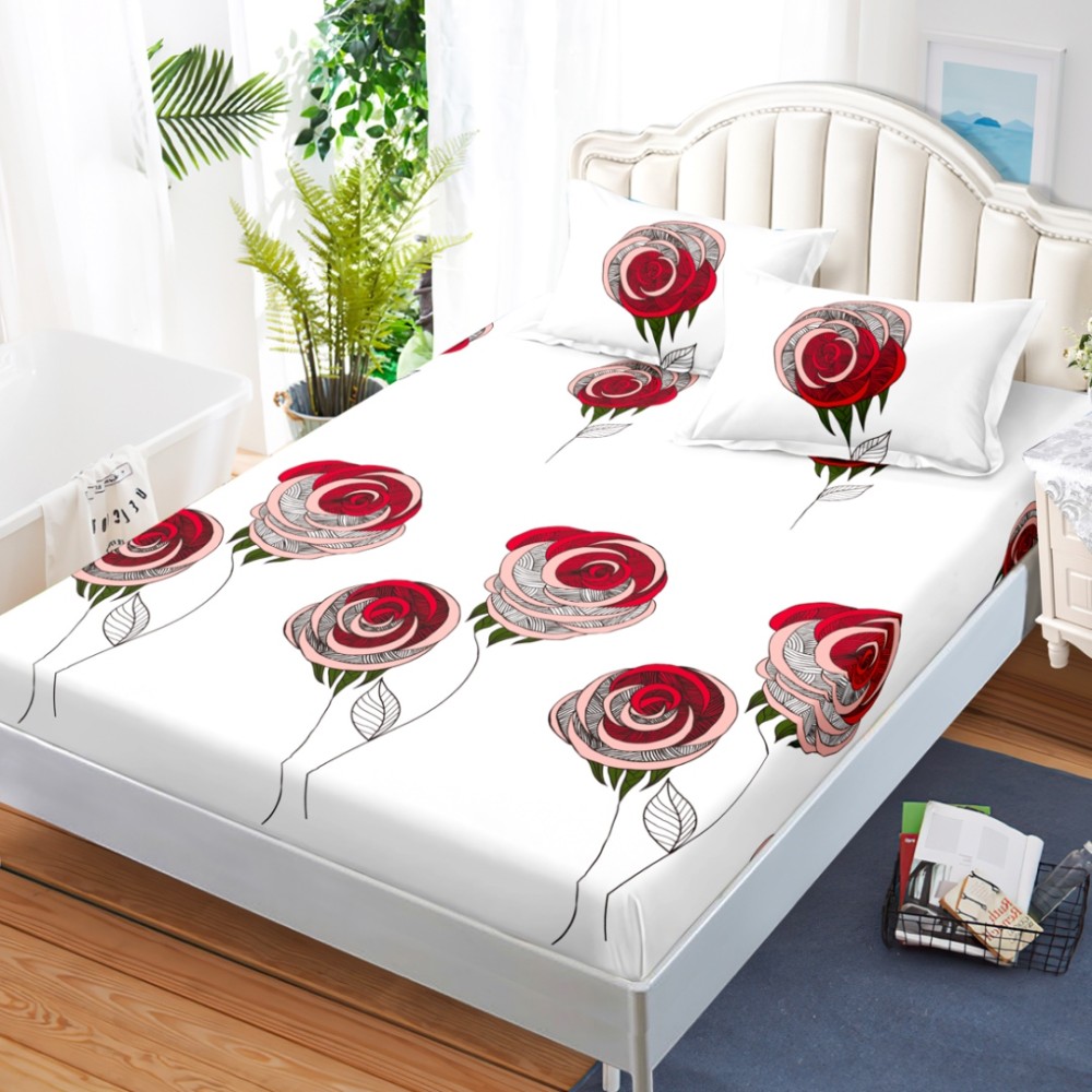 Cearsaf cu elastic, Bumbac FINET, 160x200cm, 2 fete de perne 50x70cm, Alb, Rosu, Flori, Super Design Pucioasa, cod produs: SDP-HH-110