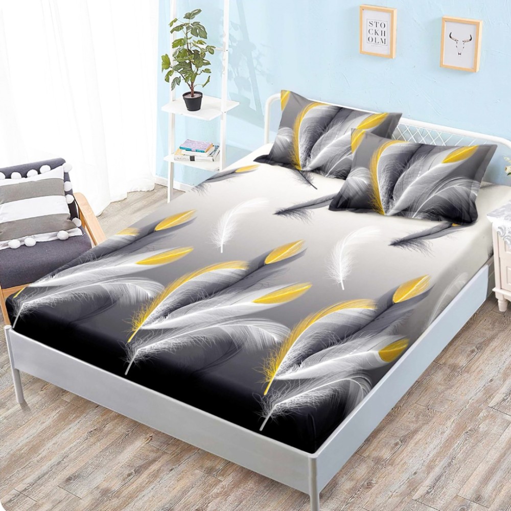 Cearsaf cu elastic, Bumbac FINET, 160x200cm, 2 fete de perne 50x70cm, Gri, Alb, Auriu, Pene, Super Design Pucioasa, cod produs: SDP-HH-158