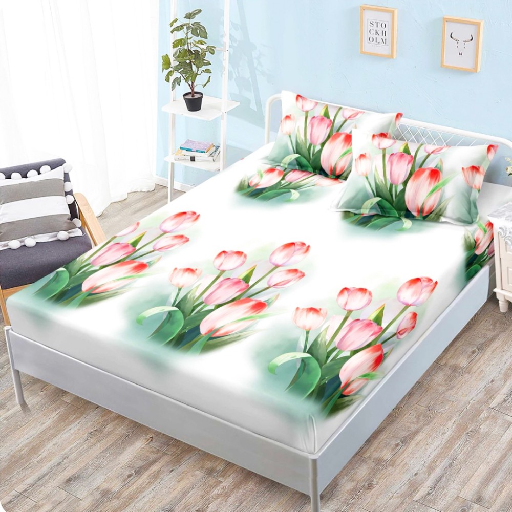 Cearsaf cu elastic, Bumbac FINET, 160x200cm, 2 fete de perne 50x70cm, Vernil, Roz, Lalele, Super Design Pucioasa, cod produs: SDP-HH-153