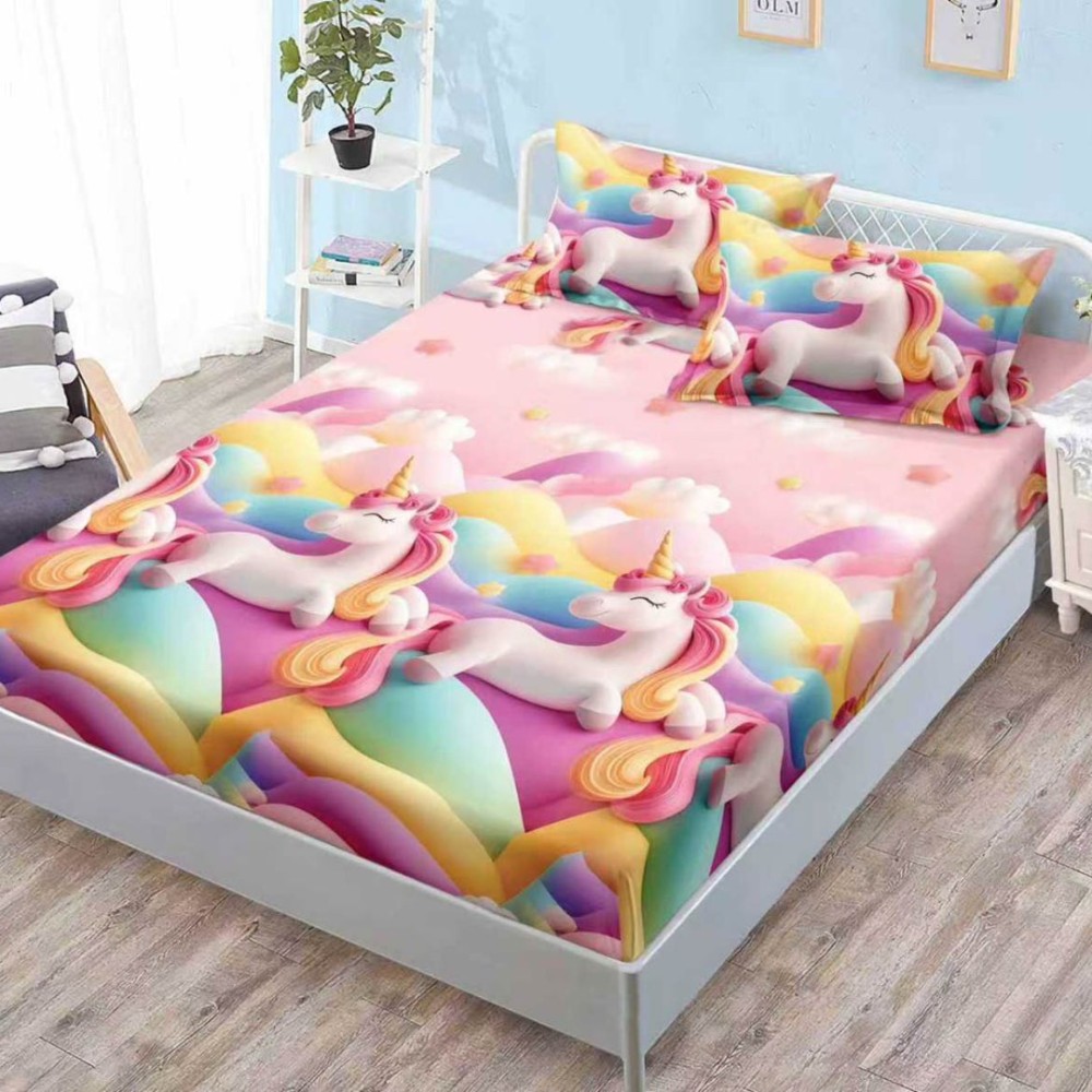 Cearsaf cu elastic, FINET, 180x200cm, 2 fete de perne 50x70cm, Roz, unicorni, Johny Home Pucioasa, cod produs: SPR-G-306