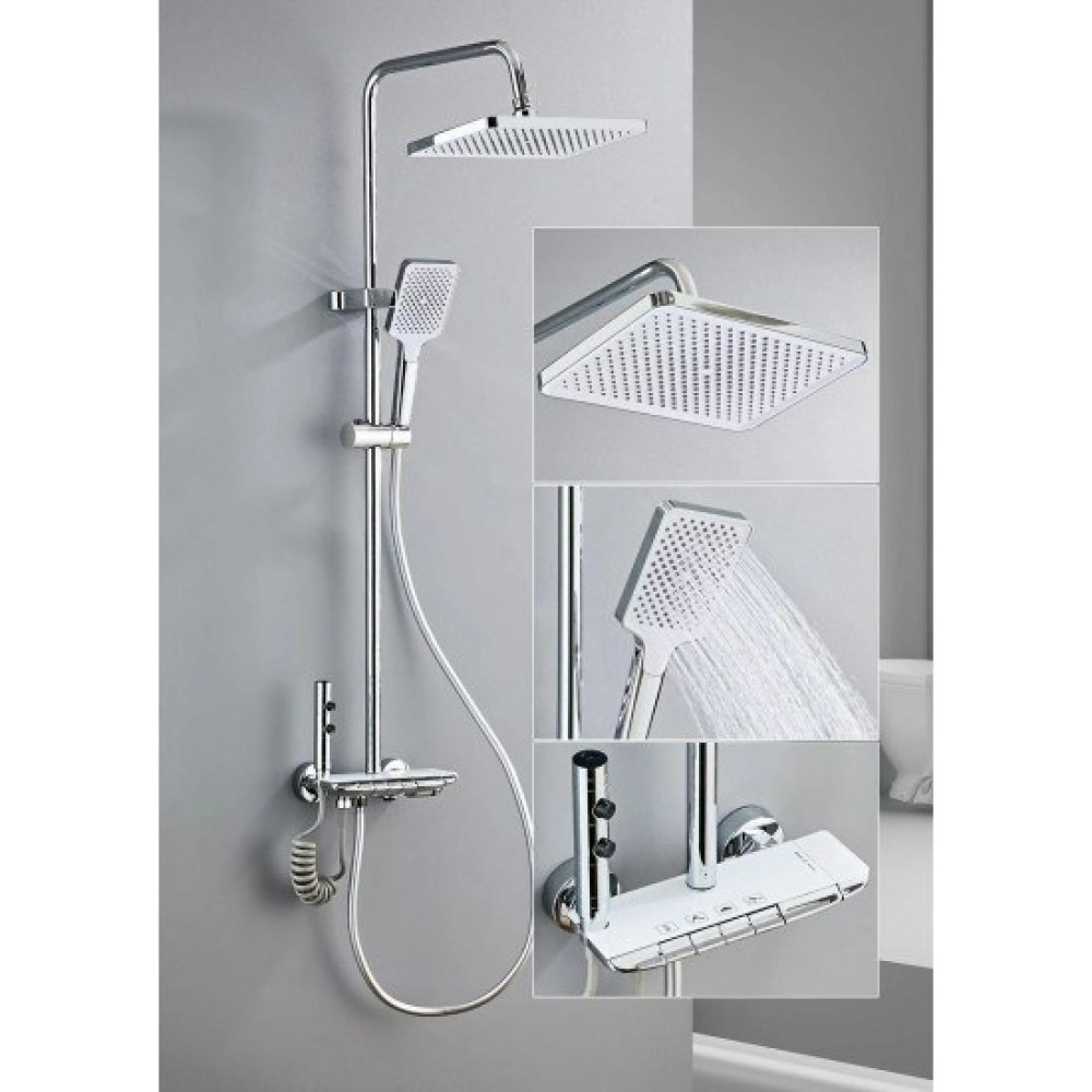 - Set Complet: Pachetul include toate componentele necesare pentru instalare, precum para de duș principală, para de duș de mână și polița din sticlă albă.