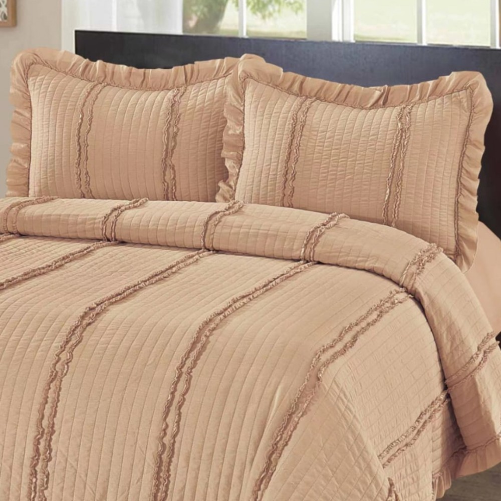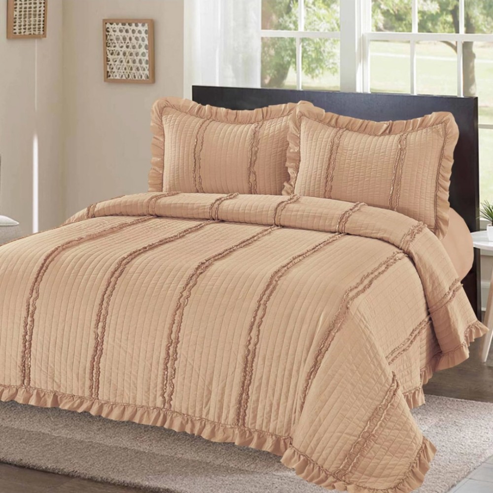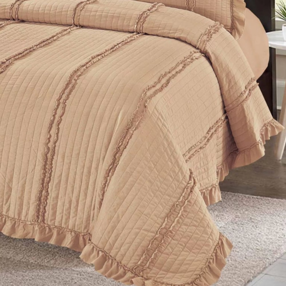 Cuvertura de Pat cu Volanase, Matlasata, 230x250 cm, 3 Piese, Bumbac Satinat Superior, 2 Fete de Perna 50x70 cm, Caramel, Insula Lenjeriei, cod produs: INS-CVU13