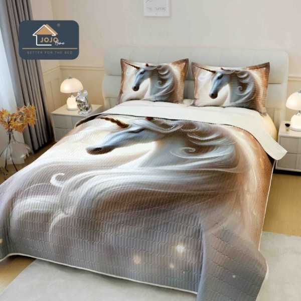 Cuvertura Matlasată, Bumbac Finet, cu Imprimeu 5D, 220x240cm + 2 fete de perna 50x70cm, Bej, Crem, Unicorn, JOJO Home, cod produs: JOJ-CVM-36