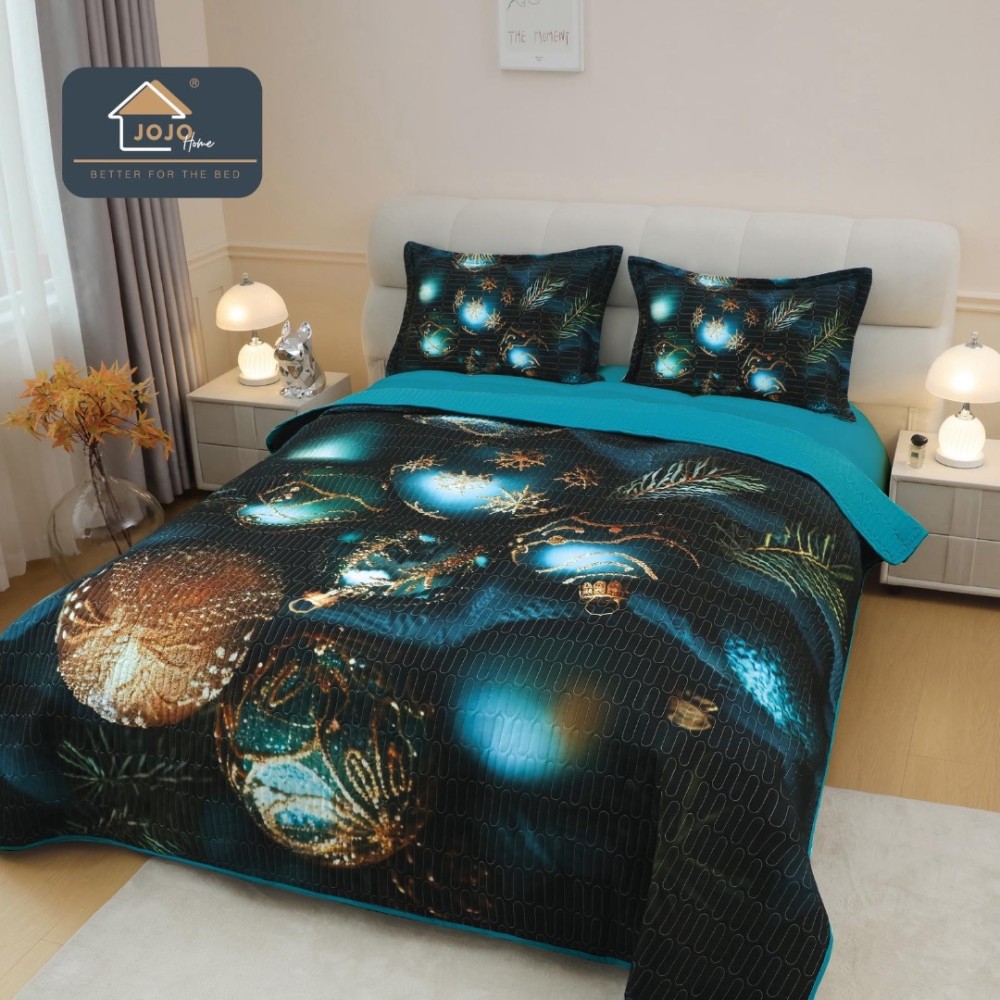 Cuvertura Matlasată, Bumbac Finet, cu Imprimeu 5D, 220x240cm + 2 fete de perna 50x70cm, Negru, Turquoise, Globulete, JOJO Home, cod produs: JOJ-CVM-08