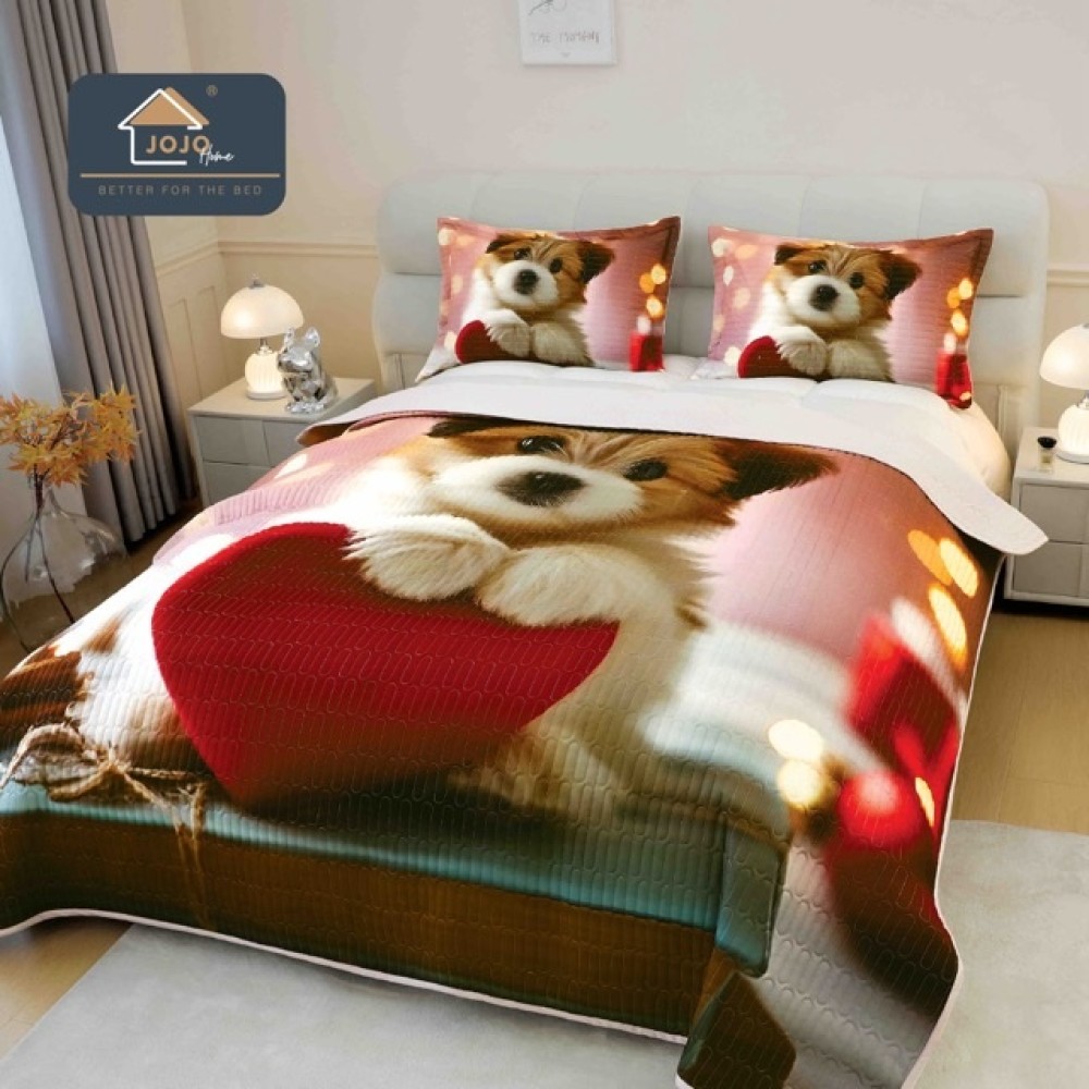 Cuvertura Matlasată, Bumbac Finet, cu Imprimeu 5D, 220x240cm + 2 fete de perna 50x70cm, Roz, Bej, Catelus cu Inimioara, JOJO Home, cod produs: JOJ-CVM-47