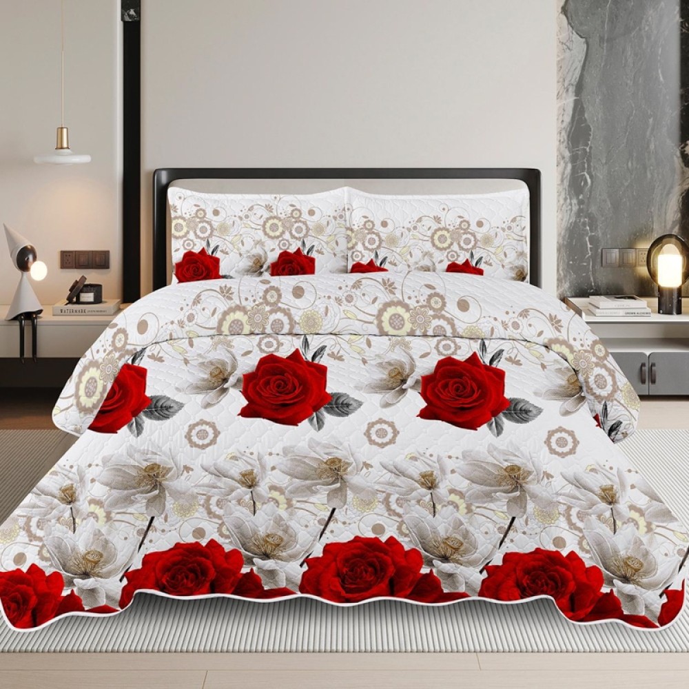 Cuvertura de pat matlasata, din bumbac satinat, 50% bumbac, 50% microfibra, imprimata, 220x240cm, cu doua fete de perna dreptunghiulare 50x70cm.