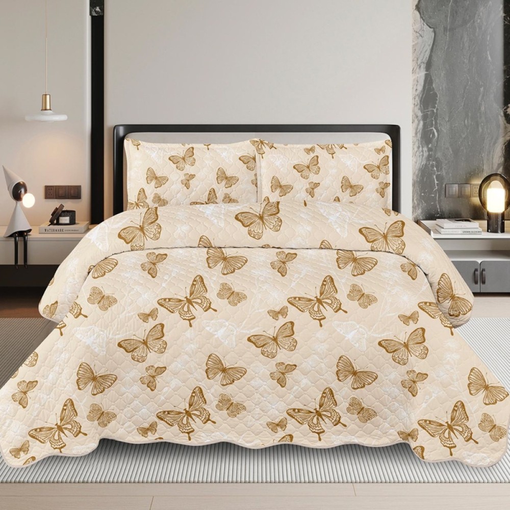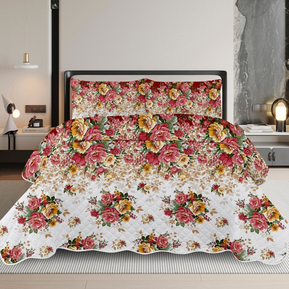 Cuvertura de pat matlasata, din bumbac satinat, 50% bumbac, 50% microfibra, imprimata, 220x240cm, cu doua fete de perna dreptunghiulare 50x70cm.