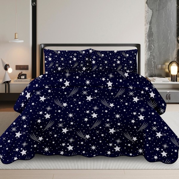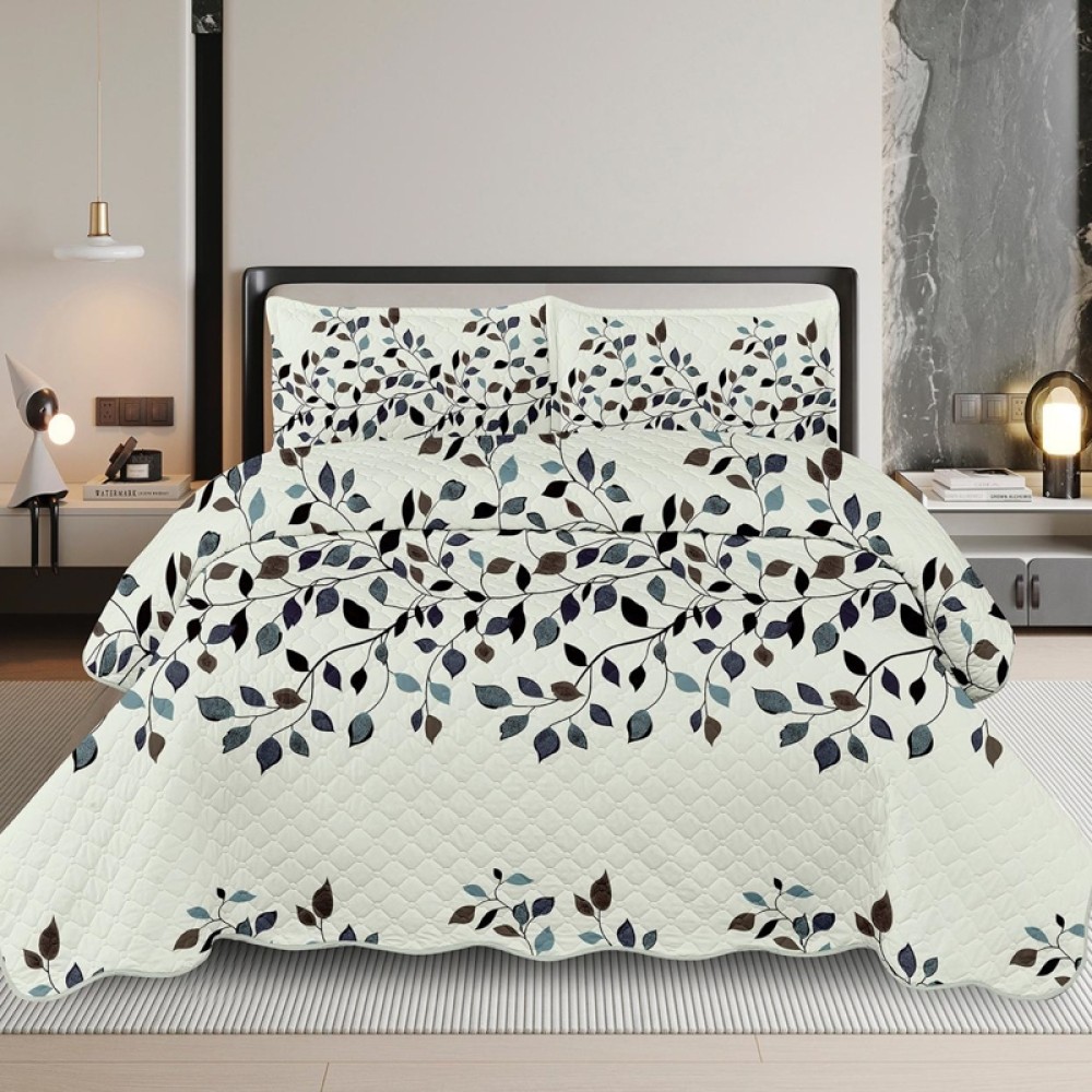 Cuvertura de pat matlasata, din bumbac satinat, 50% bumbac, 50% microfibra, imprimata, 220x240cm, cu doua fete de perna dreptunghiulare 50x70cm.