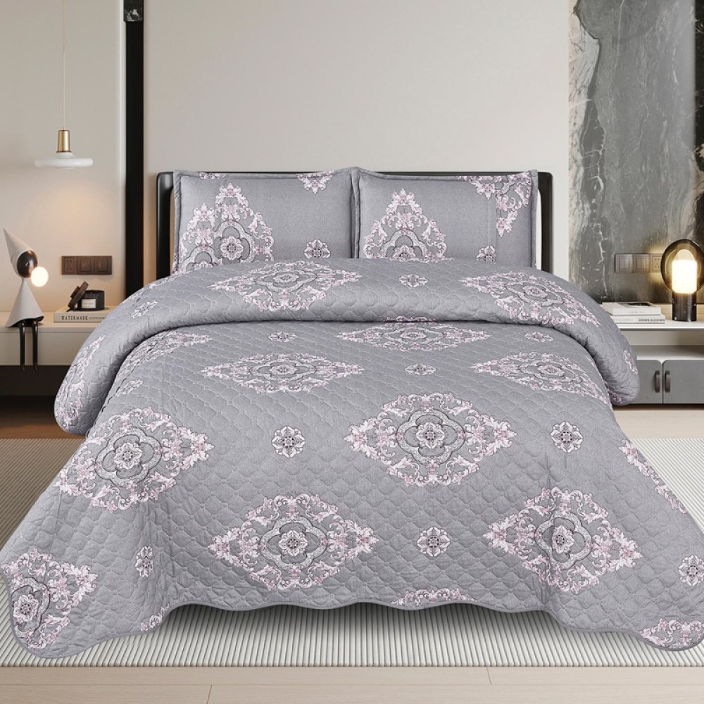 Cuvertura de pat matlasata, din bumbac satinat, 50% bumbac, 50% microfibra, imprimata, 220x240cm, cu doua fete de perna dreptunghiulare 50x70cm.