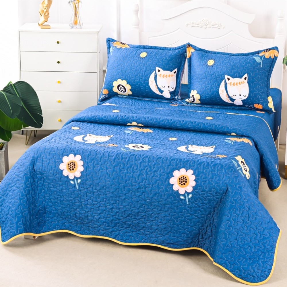 Cuvertura Matlasata din Bumbac Satinat, cu Bordura în Valuri (180x220 cm) + 2 Fete de Perna (60x80 cm), Albastru, Flori, Insula Lenjeriei, cod produs: INS-CVS92