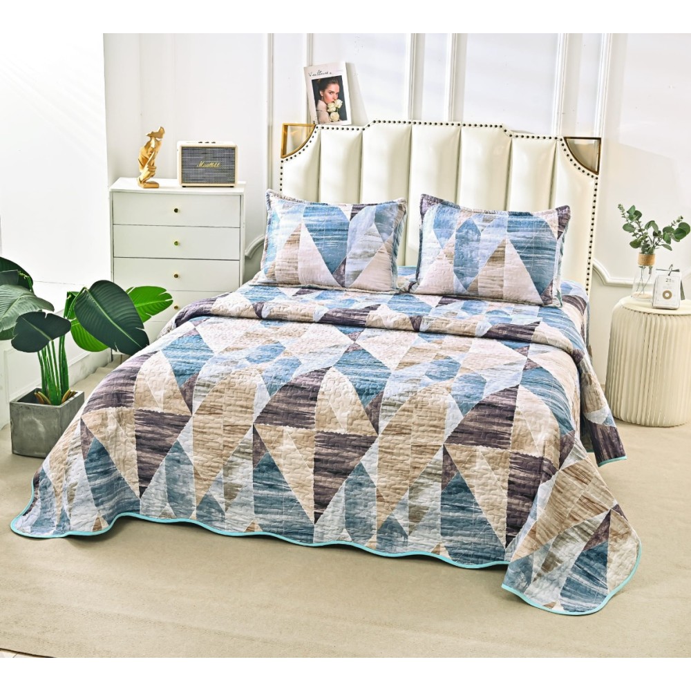 Cuvertura Matlasata din Bumbac Satinat, cu Bordura în Valuri (220x240 cm) + 2 Fete de Perna (52x72 cm), Albastru, Bej, Maro, Forme Geometrice, Insula Lenjeriei, cod produs: INS-CVS50