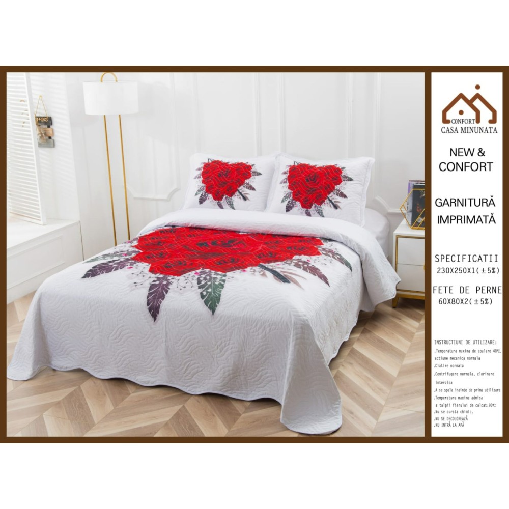 Cuvertura Matlasata, Pat Dublu, 230x250 cm, 3 Piese, Bumbac Finet Satinat, Imprimeu Digital, IDENTIC CU POZA, 2 Fete de Perna 60x80 cm, alb, rosu, trandafiri, Insula Lenjeriei, cod produs: INS-CVD18