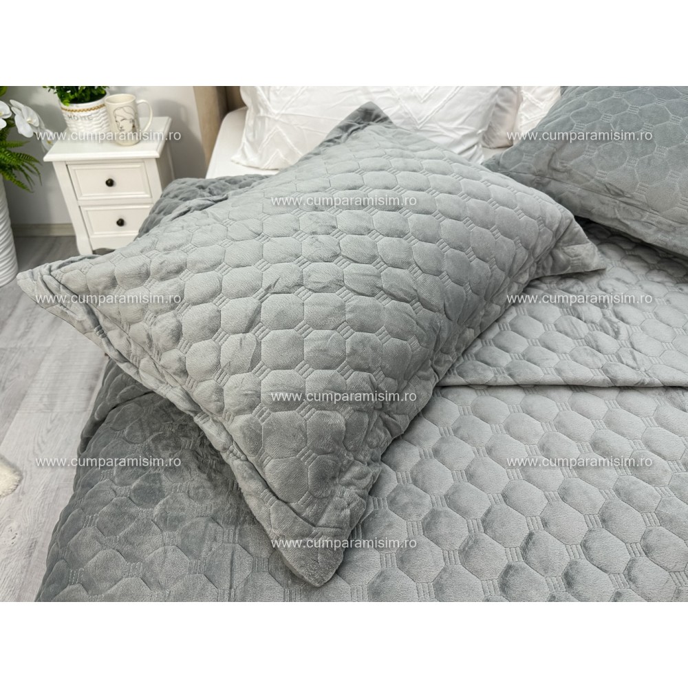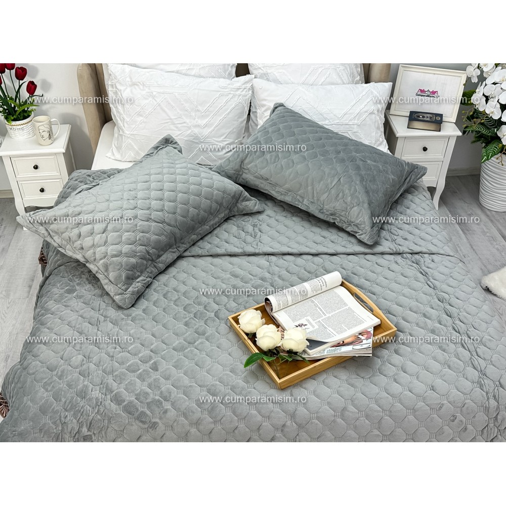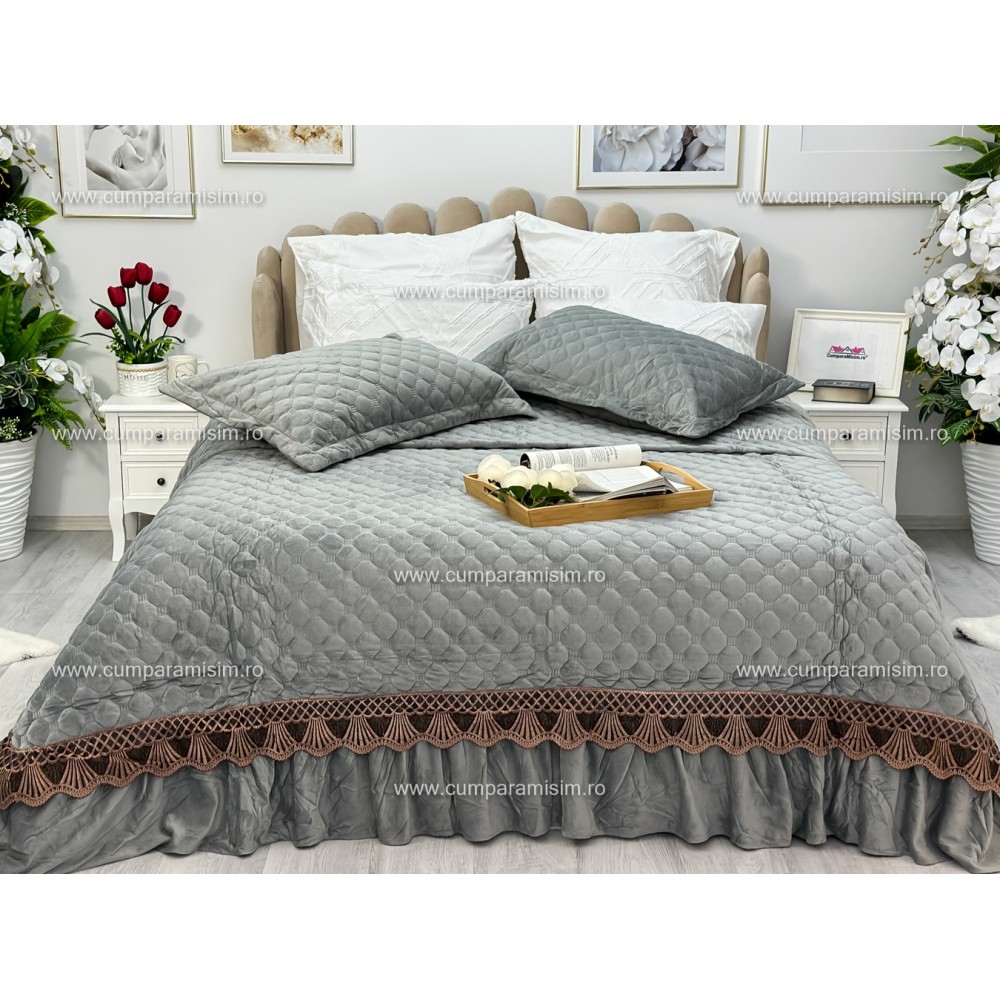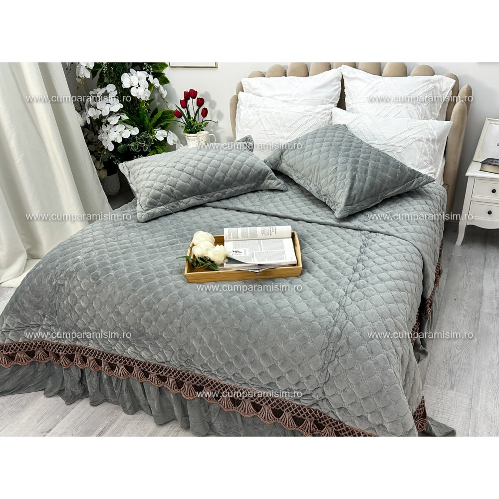Cuvertură de lux, pentru pat 2 persoane, din catifea, matlasata, cu volanase pe partea de jos, accesorizate cu o eleganta broderie aurier, pentru un plus de eleganta si rafinament.