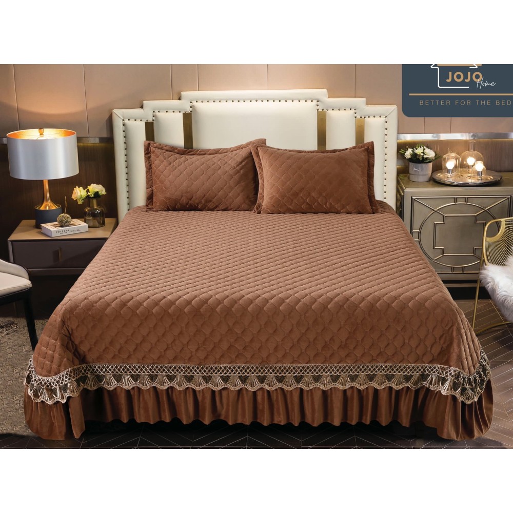 Cuvertură de lux, pentru pat 2 persoane, din catifea, matlasata, cu volanase pe partea de jos, accesorizate cu o eleganta broderie aurier, pentru un plus de eleganta si rafinament.