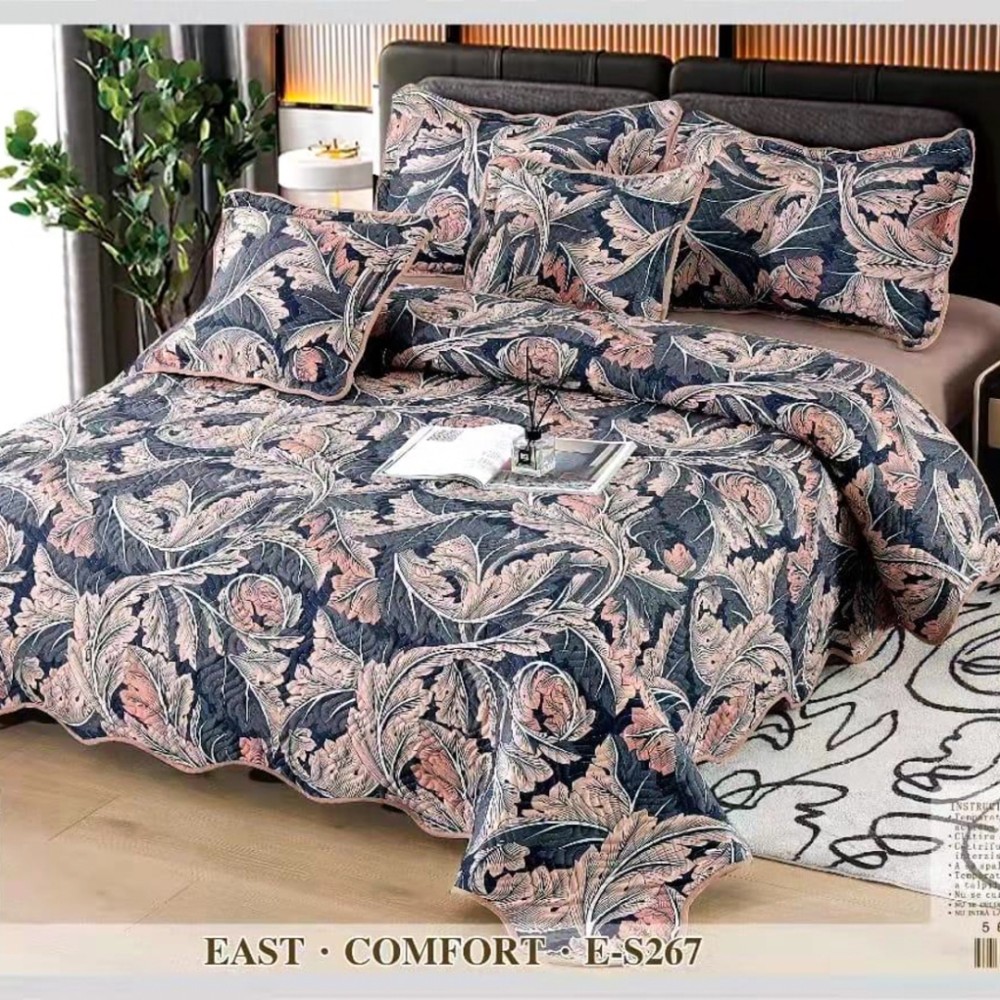 Cuvertura matlasata 230x250cm si 4 fete de perna, Bumbac, Bleumarin, Roz, frunze, East Romania, cod produs: EST-E-S267