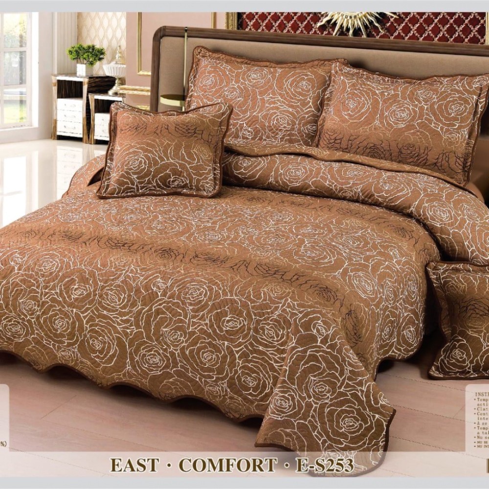Cuvertura matlasata 230x250cm si 4 fete de perna, Bumbac, Maro, Alb, trandafiri, East Romania, cod produs: EST-E-S253