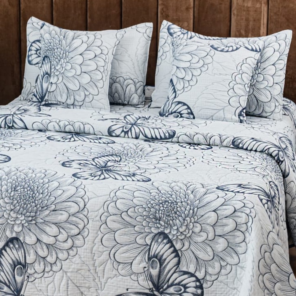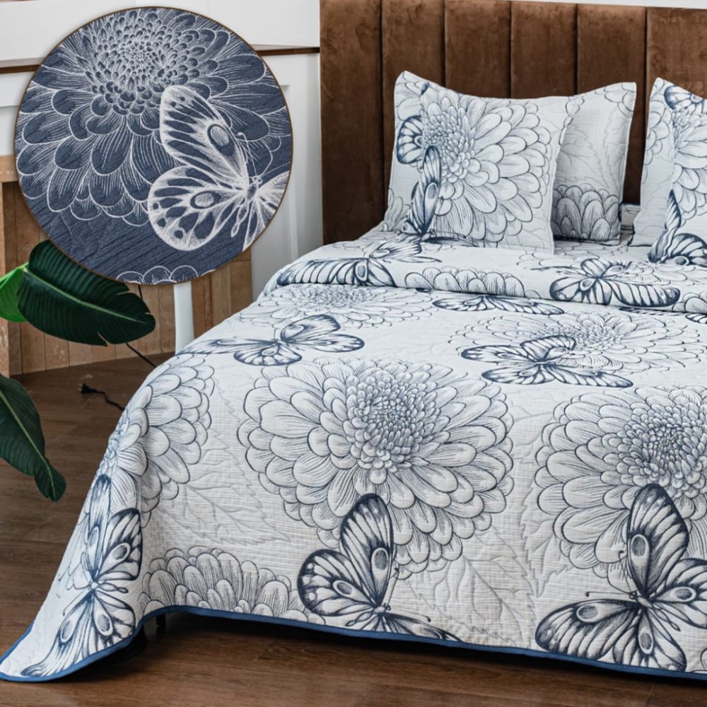 Cuvertura Pat Dublu, Bumbac cu In, Model Brodat Direct în Tesatura, 230x250 cm, 2 fete de perna 52x72cm, 2 fete de perna 46x46cm, Alb, Albastru, Crizanteme, Fluturi, Insula Lenjeriei, cod produs: INS-CVY10