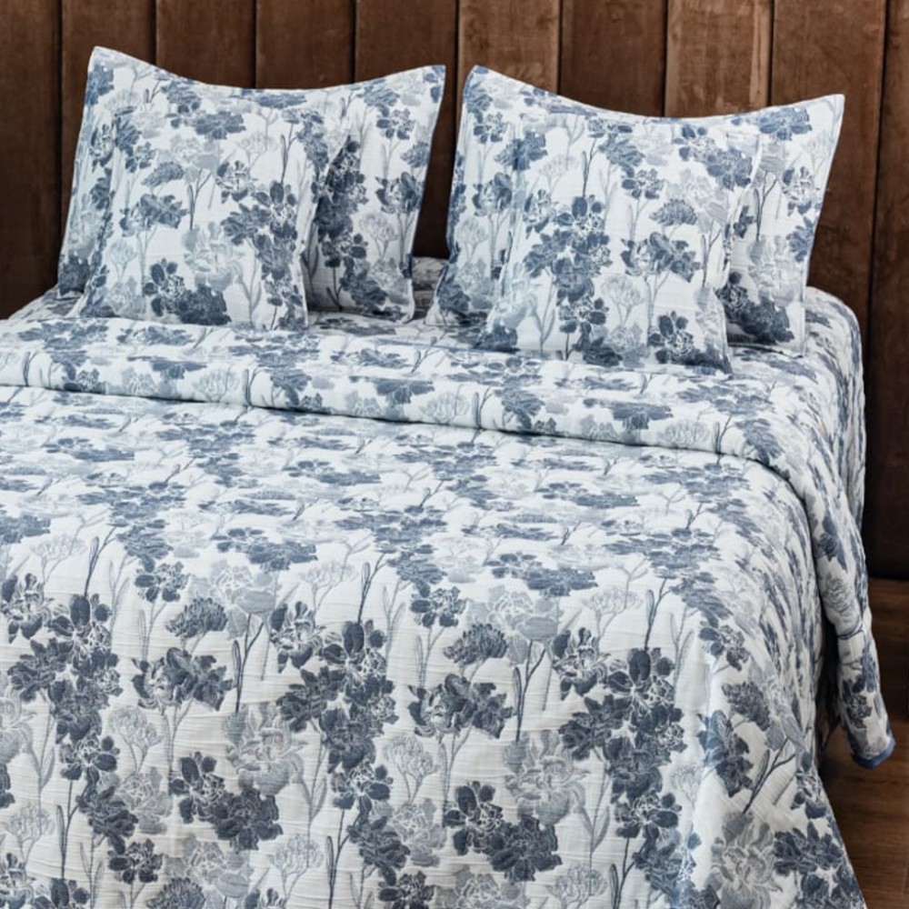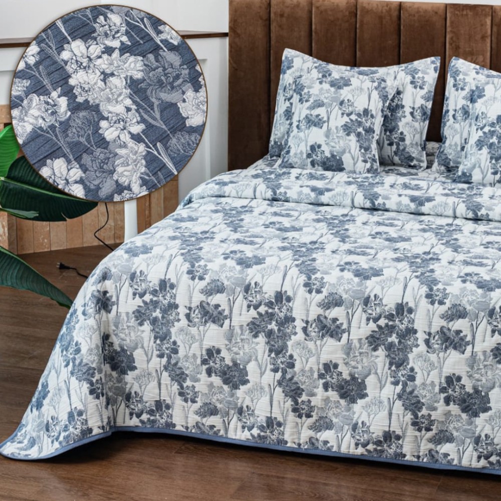 Cuvertura Pat Dublu, Bumbac cu In, Model Brodat Direct în Tesatura, 230x250 cm, 2 fete de perna 52x72cm, 2 fete de perna 46x46cm, Alb, Albastru, Flori, Insula Lenjeriei, cod produs: INS-CVY01