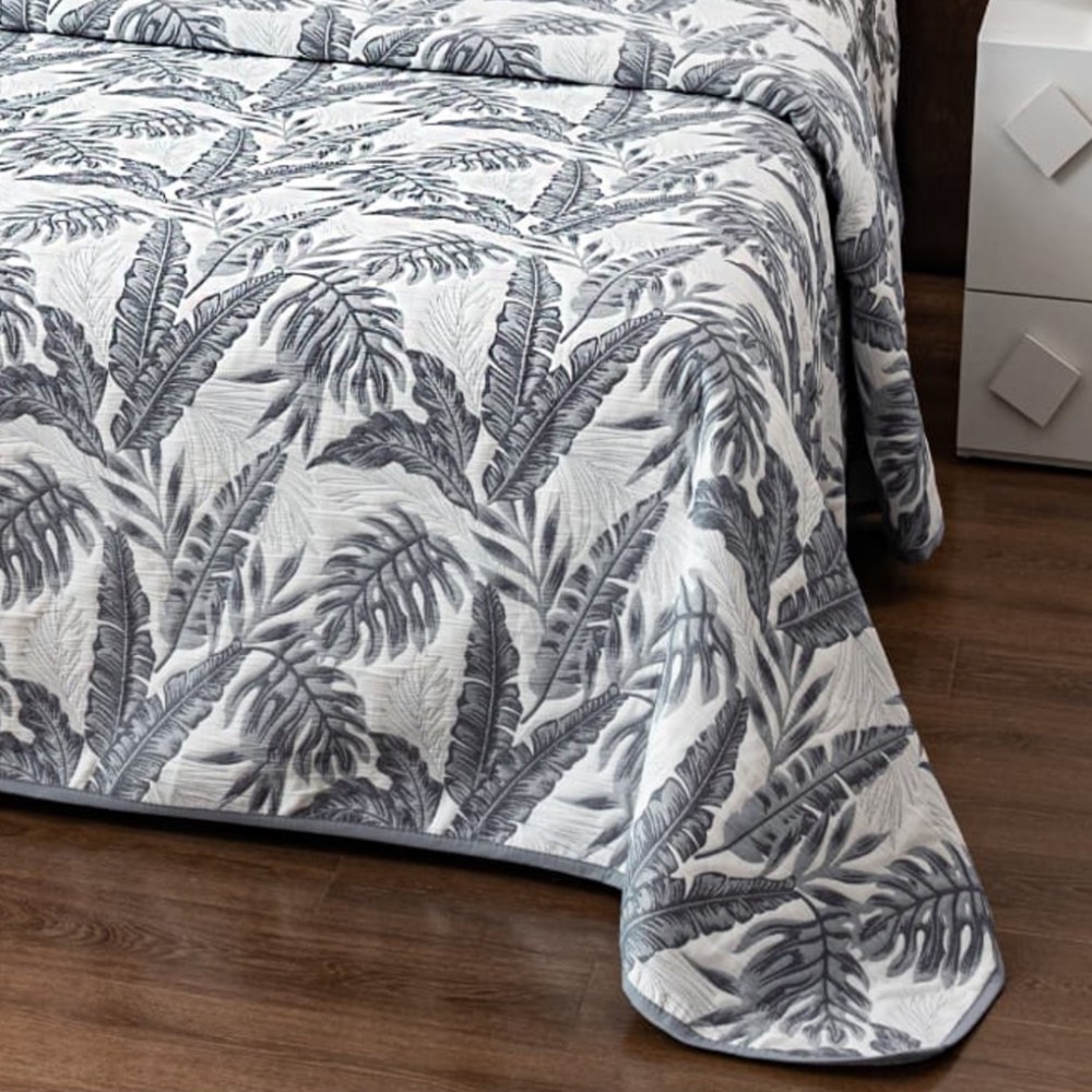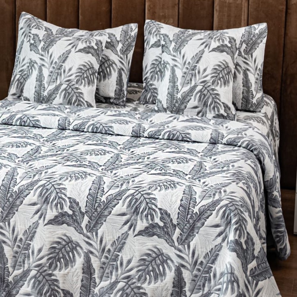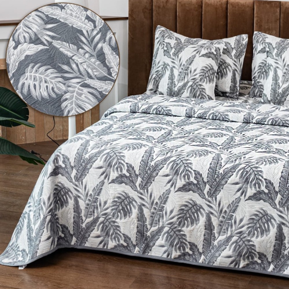 Cuvertura Pat Dublu, Bumbac cu In, Model Brodat Direct în Tesatura, 230x250 cm, 2 fete de perna 52x72cm, 2 fete de perna 46x46cm, Alb, Gri, Frunze, Insula Lenjeriei, cod produs: INS-CVY04