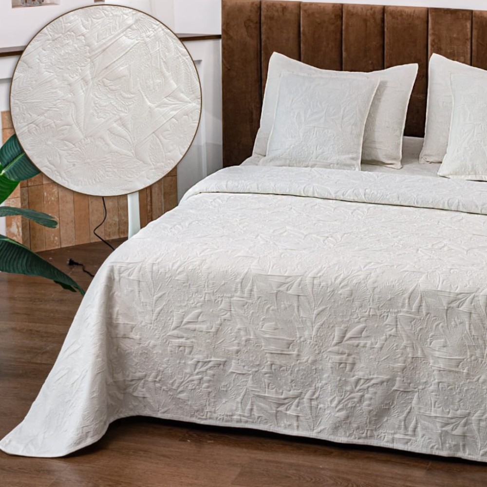 Cuvertura Pat Dublu, Bumbac cu In, Model Brodat Direct în Tesatura, 230x250 cm, 2 fete de perna 52x72cm, 2 fete de perna 46x46cm, Alb, Model Elegant, Insula Lenjeriei, cod produs: INS-CVY05