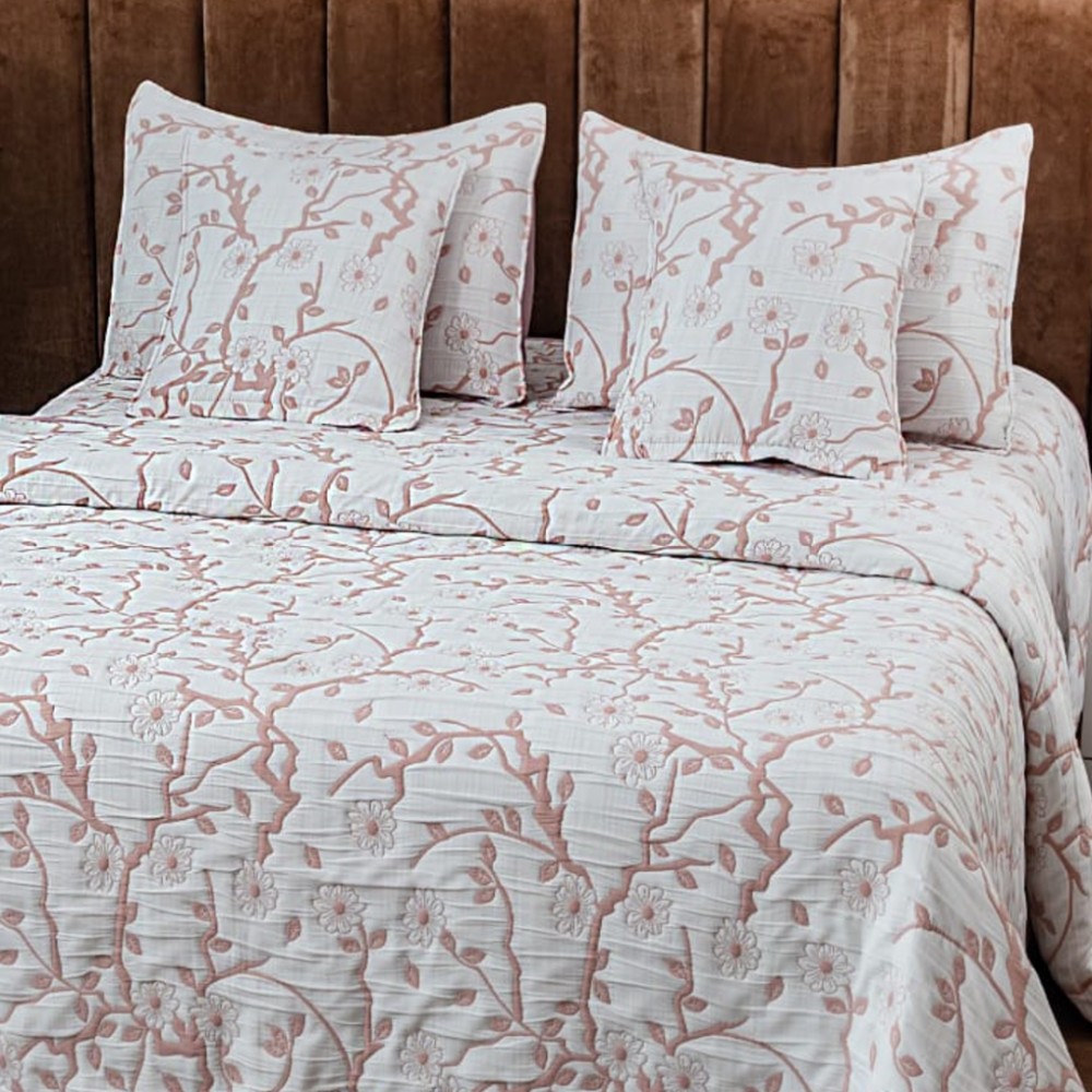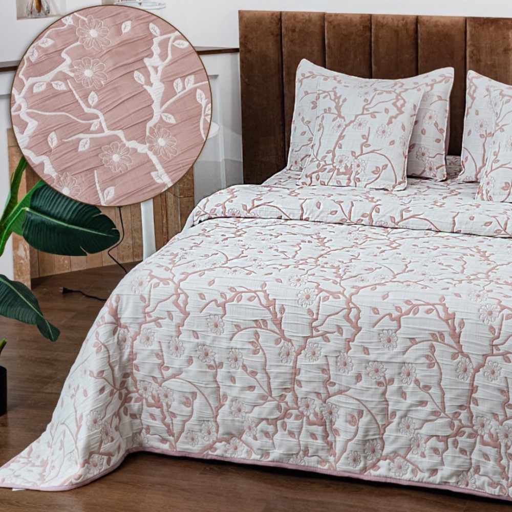 Cuvertura Pat Dublu, Bumbac cu In, Model Brodat Direct în Tesatura, 230x250 cm, 2 fete de perna 52x72cm, 2 fete de perna 46x46cm, Alb, Pudra, Crengute, Insula Lenjeriei, cod produs: INS-CVY08
